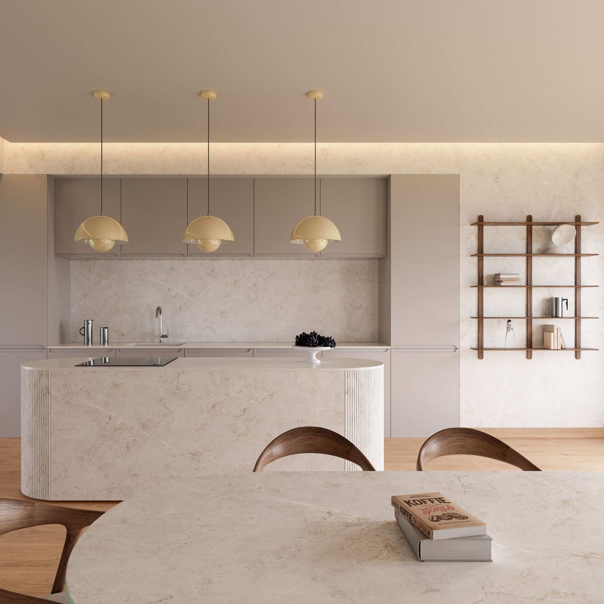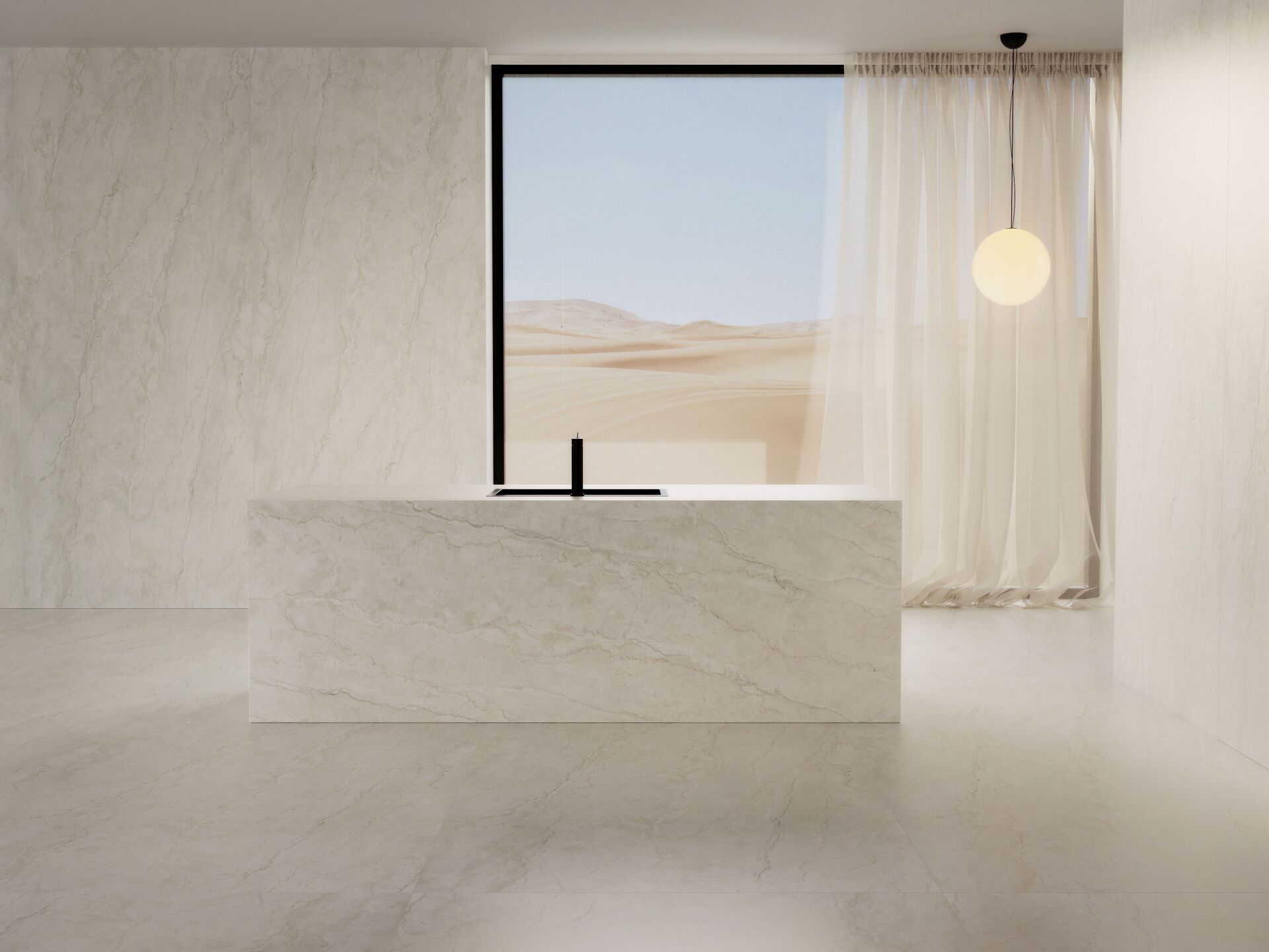 Nomak hingegen verfolgt einen Ansatz der reduzierten Eleganz. Die Kollektion mit den Farbtönen Evok, Thala und Keena setzt auf subtile Aderungen, weiche Weiss‑, Grau‑ und Aschetöne und eine ruhige, zeitlose Designsprache. Die Oberflächen schaffen visuelle Klarheit und ein harmonisches Gesamtbild – perfekt für Projekte, die auf räumliche Einheit, Leichtigkeit und architektonische Ordnung setzen.