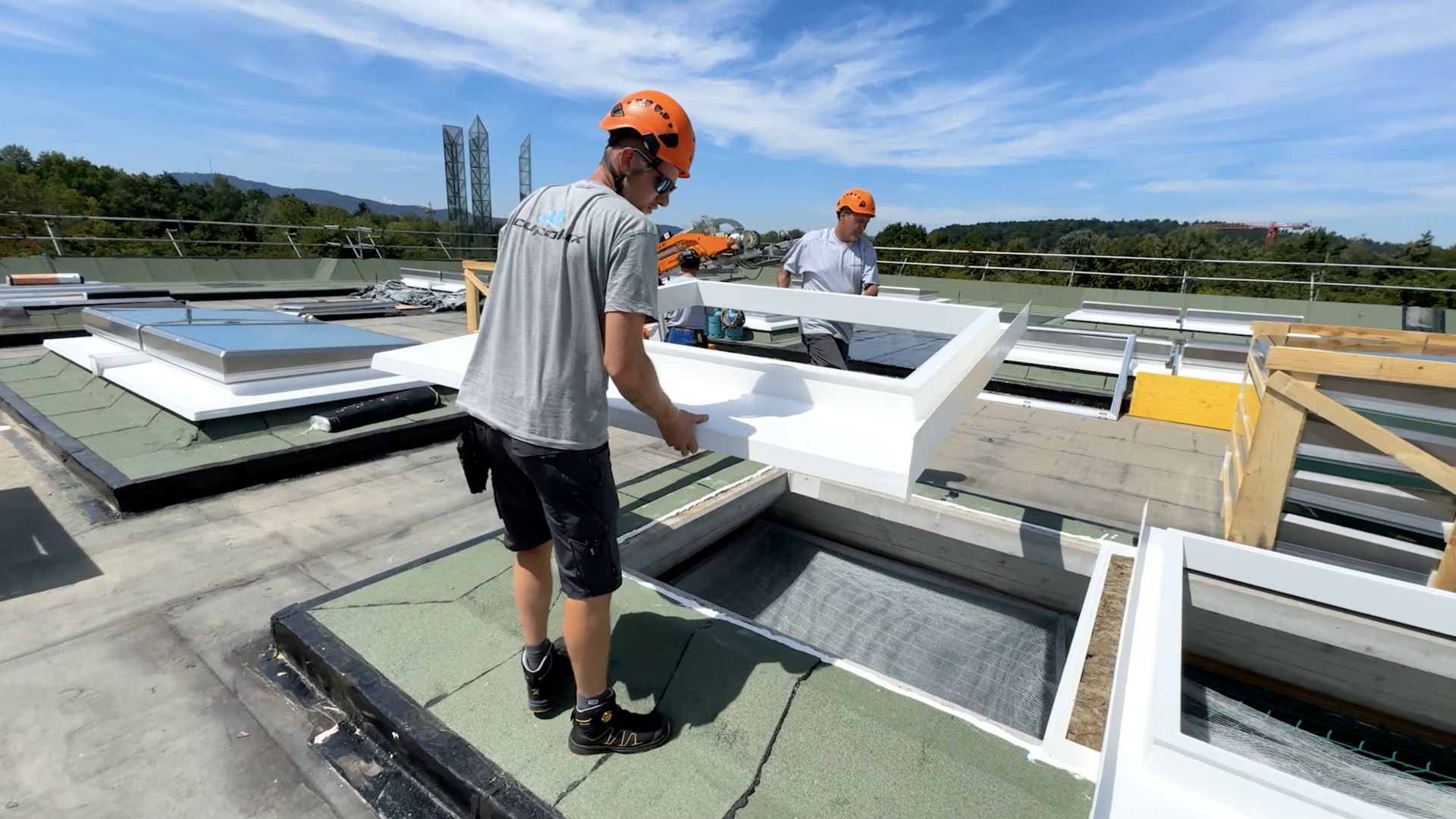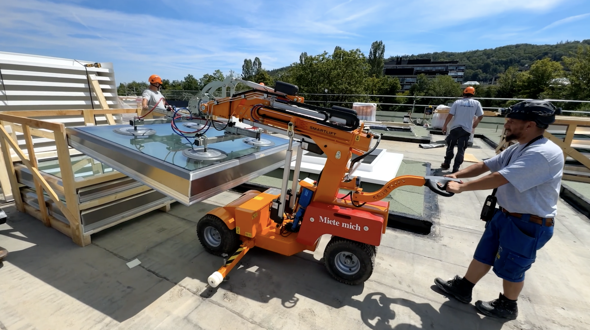 Die Montage der 48 Glasoberlichter auf die Doppel-Minizargen erfolgte durch die Crew der Cupolux AG mittels Montageroboter. Jede Bewegung sass wie ein perfekt choreographierter Landeanflug. Aufgrund der engen Zufahrten konnte nur ein kleiner mobiler Kran verwendet werden, welcher lediglich das Heben der Oberlichter an den Dachrand ermöglichte. Als Tageslicht-Pionier montiert und installiert Cupolux nicht nur die gewünschten Tageslichtlösungen, sondern übernimmt von der Planung über die Auslieferung und Montage bis zur Inbetriebnahme und jährlichen Wartung sämtliche Disziplinen und ist Garant für die einwandfreie Funktion und Qualität der installierten Tageslichtlösungen. Die Universität Zürich fungierte als Auftraggeberin, während das Baumanagement über die Gächter erfolgte. Die Moral der Geschichte: Manchmal braucht ein Gebäude einfach eine Typenveränderung – und die richtige Crew kann Wunder bewirken.