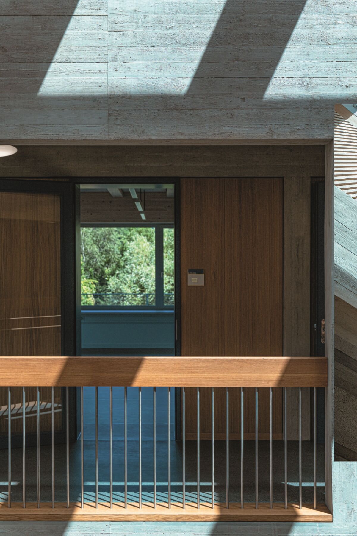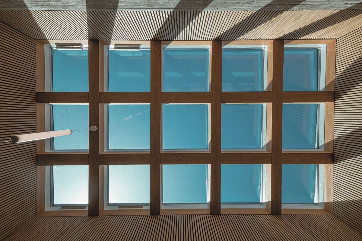 Eine grosse Oberlicht-Komposition über dem Erschliessungskern flutet das Entree und die breite zweiläufige Treppenanlage mit natürlichem Licht. Gezeichnet durch das Raster seiner Unterzüge, inszeniert es wie moderne Fresken die Betonwände und Eichenholzböden und verleiht dem Raum eine lebhafte Atmosphäre. Die rund vier mal sieben Meter grosse Öffnung befindet sich eineinhalb Meter über der Decke des obersten Geschosses. Um die Innenwände des Dachaufbaus ziehen sich Holzlamellen, die für eine gute Raumakustik sorgen.