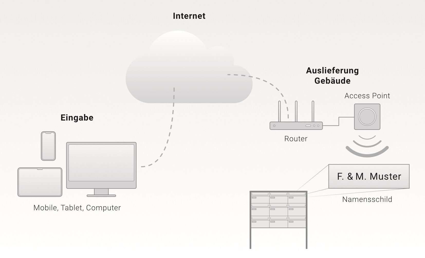 Für die Verwaltung wird eine cloudbasierte Webanwendung genutzt. Damit können Änderungen orts- und zeitunabhängig erfolgen. Ein Besuch vor Ort ist ebenso wenig nötig wie das Beauftragen von externen Dienstleistern wie Facility Management, Graveuren, Handwerkern und so weiter. Die Aktualisierungen werden zuerst via Kabel oder GSM-Netz an einen Access Point übermittelt und von dort auf die Displays. Der Access Point ist ein unauffälliges Gerät, das in der Nähe der Anlage oder im Sonneriefach platziert wird.