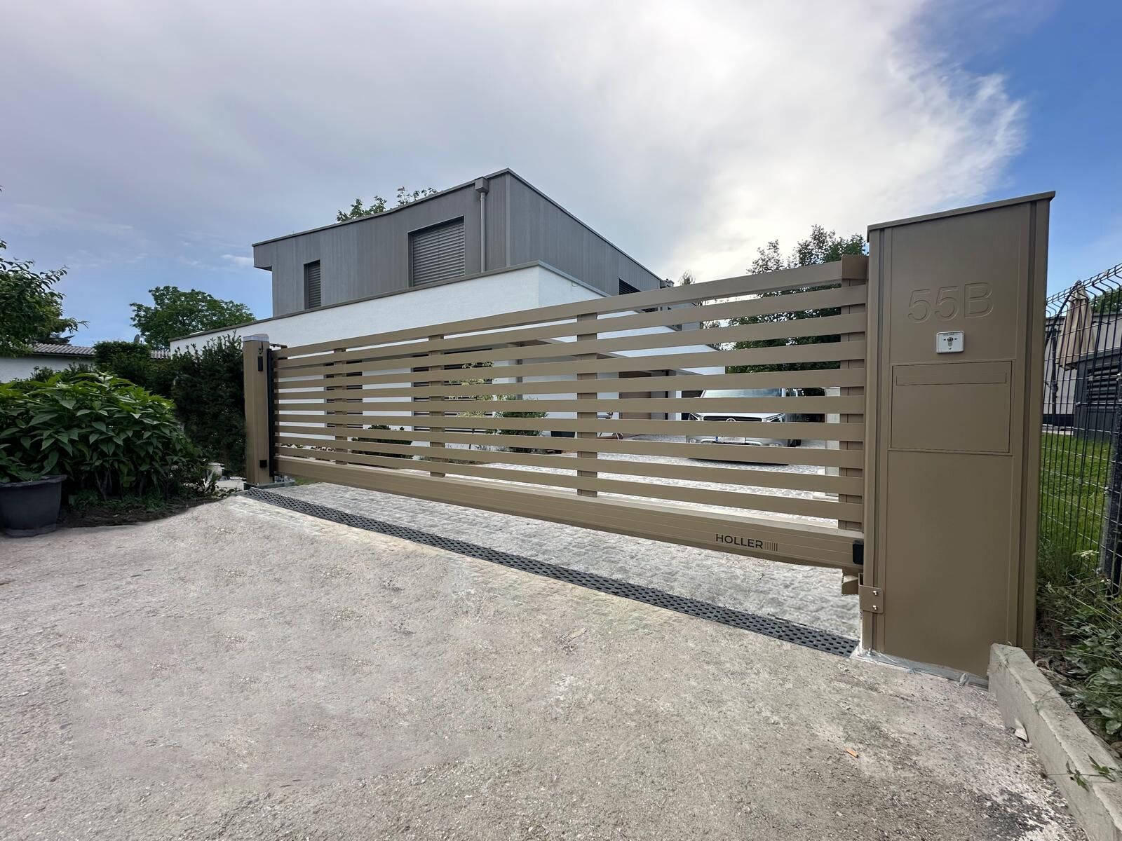 Präzise gefertigtes Schiebetor mit durchlässiger Lamellenstruktur, abgestimmt auf die Fassadengestaltung | Foto © Holler Tore AG