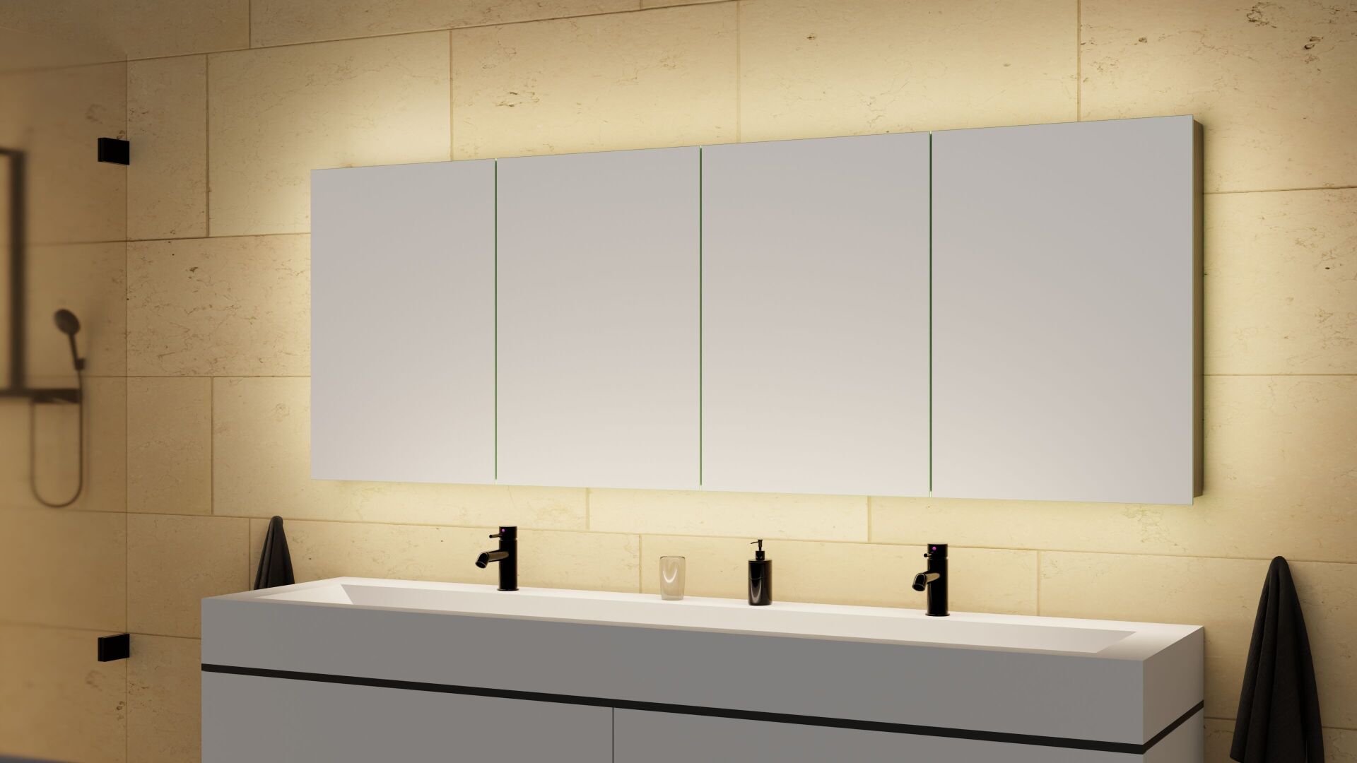 Mit dem Spiegelschrank Auralis präsentiert die Keller Spiegelschränke eine Lösung, die modernes Lichtdesign mit hochwertiger Schweizer Produktion und durchdachter Funktionalität verbindet. Das prägende Element des Auralis ist seine konsequent indirekte Beleuchtung. Statt einer direkten Ausleuchtung erzeugt das integrierte LED-Licht eine sanfte, blendfreie Lichtstimmung, die den Raum gleichmässig erhellt und eine angenehme Atmosphäre schafft. Diese indirekte Lichtführung sorgt nicht nur für eine hochwertige Anmutung, sondern unterstützt auch eine harmonische Raumwirkung im Badezimmer. Selbst bei geöffneten Türen bleibt die Lichtqualität uneingeschränkt erhalten. So profitieren Nutzer*innen jederzeit von optimalen Lichtverhältnissen – unabhängig davon, ob der Schrank geöffnet oder geschlossen ist.