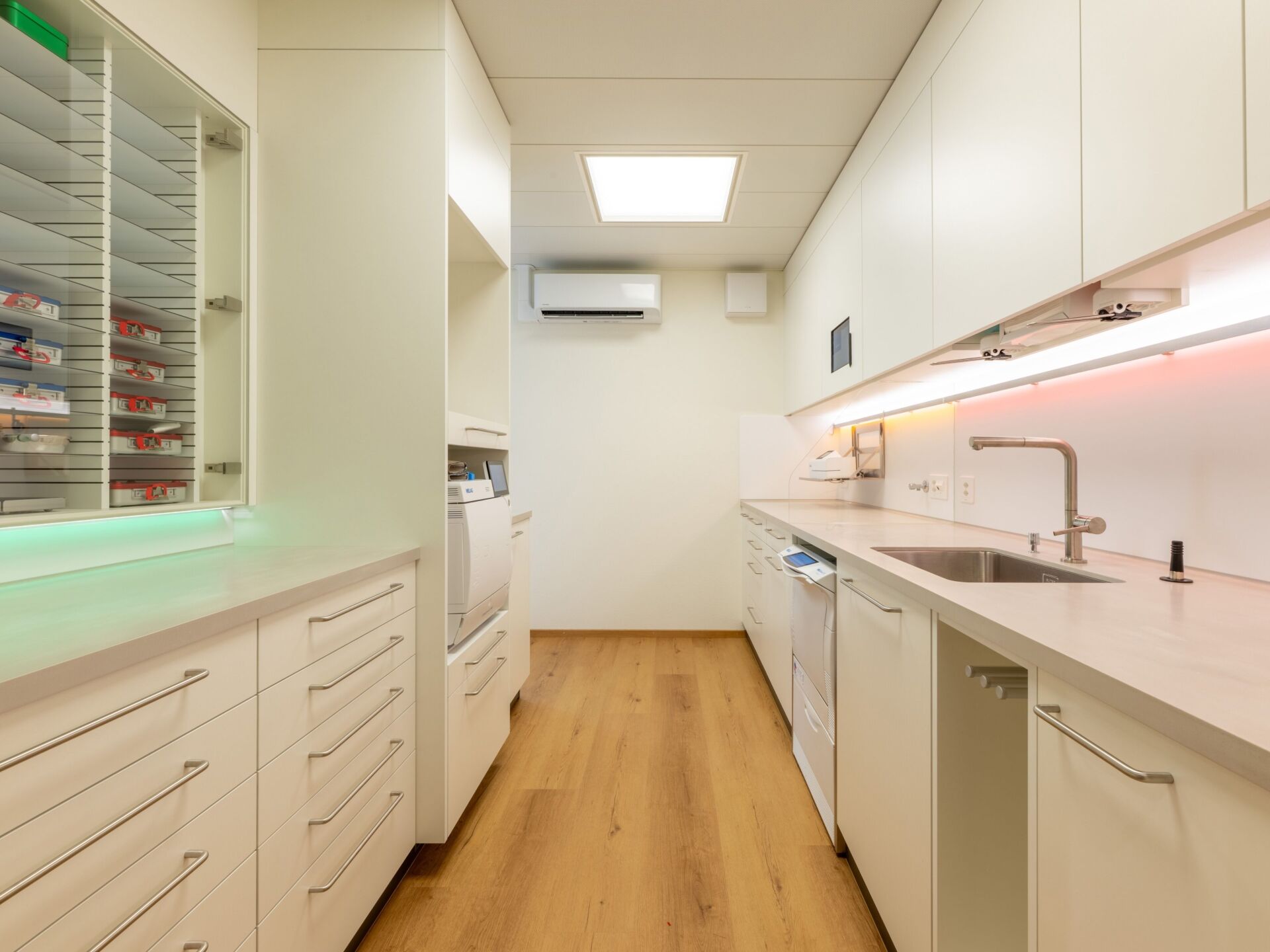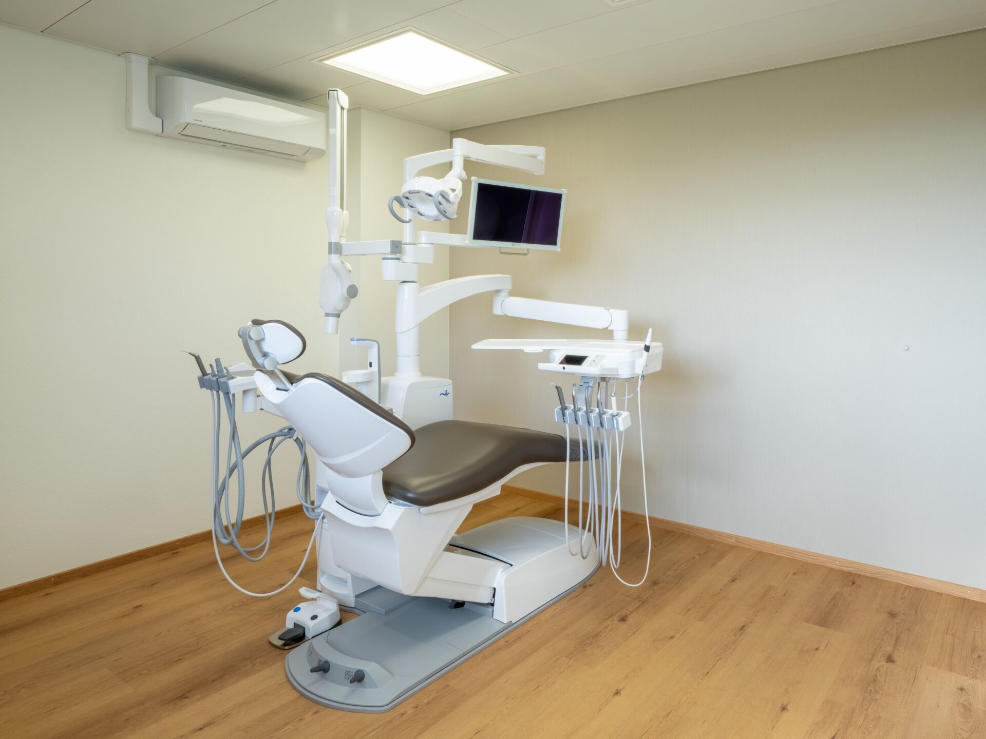 Dass Technik hier so selbstverständlich wirkt, ist kein Zufall. Die Planung begann nicht erst mit der Wahl der Geräte, sondern bereits in der Entwurfsphase. Marcel Baechler, Innenarchitekt vsi.asai. REG B, verantwortlich für die Gestaltung der Praxis von Dr. med. dent. Sebastian Bolt, beschreibt diesen Ansatz so: «Unsere langjährige Erfahrung in der Praxisplanung hilft uns enorm. Schon vom ersten Entwurf an planen wir alle Leitungsführungen im Boden und in der Decke mit ein. Entscheidend ist, dass Klima- und andere sichtbare Geräte von Beginn an Teil des Gestaltungskonzepts sind, nur so entsteht ein harmonisches Gesamtbild.»