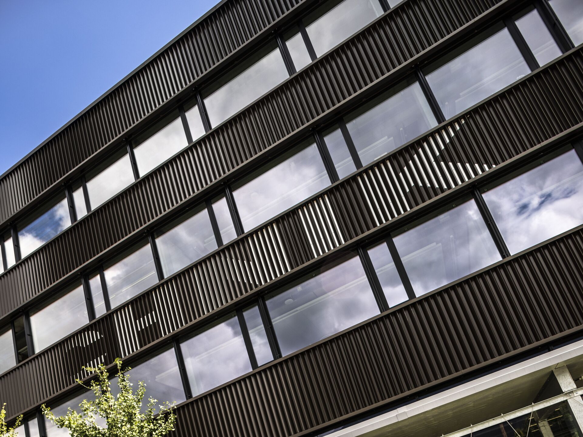 Die hinterlüftete Konstruktion erfüllt zudem hohe bauphysikalische Anforderungen und überzeugt durch Langlebigkeit und Wirtschaftlichkeit. Der warme Farbton Dark Bronze matt verstärkt die räumliche Tiefe der Profilierung und unterstützt den changierenden Effekt der wellenförmigen Struktur.