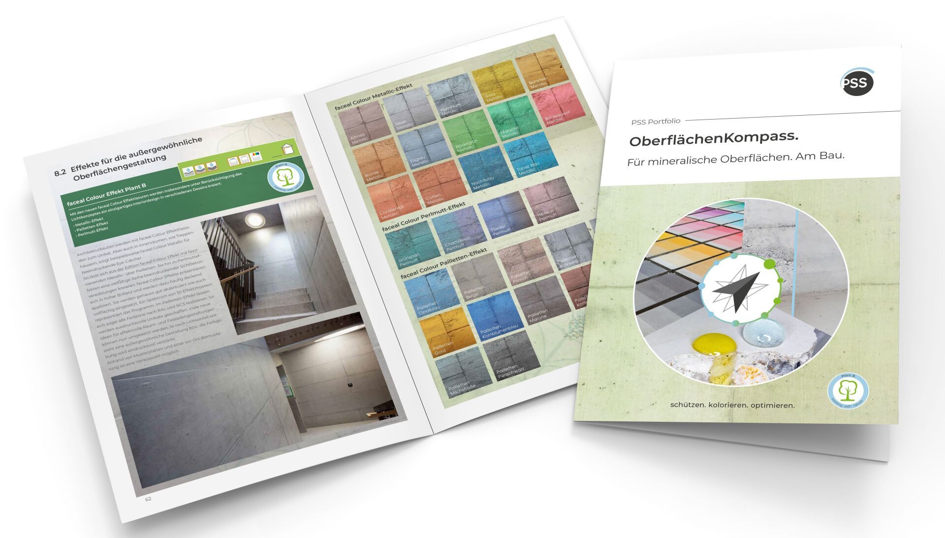 Der neue «PSS OberflächenKompass» präsentiert ein komplettes Portfolio für die fachgerechte Behandlung mineralischer Oberflächen. Viele Themengebiete angefangen von Schmutz- und Graffitischutz über die Möglichkeiten oleo- und hydrophober Oberflächenbehandlung bis hin zu semitransparenter Gestaltung und kosmetischer Behandlung von Betonoberflächen werden hier im Sinne eines Fachbuches beschrieben, die verschiedenen Technologien und Systeme werden vorgestellt und eine grosse Matrix zeigt zusammenfassend deren differenzierten Leistungsmerkmale auf. Mit dabei sind natürlich die neuen biobasierten PSS Oberflächensysteme auf Basis nachwachsender Rohstoffe. Darüber hinaus begeistert der «PSS OberflächenKompass» durch die zahlreichen Bilddarstellungen und Grafiken. So werden technische Aspekte wie beispielweise eine Tiefenhydrophobierung genau so anschaulich visualisiert wie die anmutenden Farbgestaltungen mit faceal Colour Plant B.