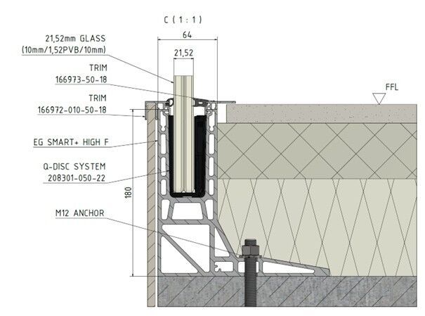 Easy Glass Smart+ High-F-Variante für hohe Bodenaufbauten mit präziser Glasaufnahme und integrierter Befestigung. | Detail © Q-railing