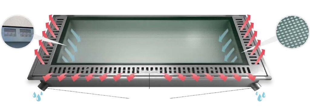 Der Schmutz sammelt sich für eine bequeme, von aussen vorzunehmende Reinigung in einem für Inspektionszwecke zu öffnendem Kanal. Netze mit Mikroöffnungen verhindern das Eindringen von Insekten und Schmutz.
