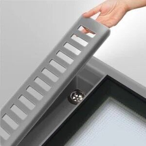 Lucernario aerante INOX fängt das Regenwasser in seinem Ablaufkanal auf und ermöglicht die Lüftung des Kellergeschosses durch die Luftöffnungen. Diese Luftöffnungen, die immer geöffnet sind, sind durch Insekten- und Schmutzfangnetze geschützt.