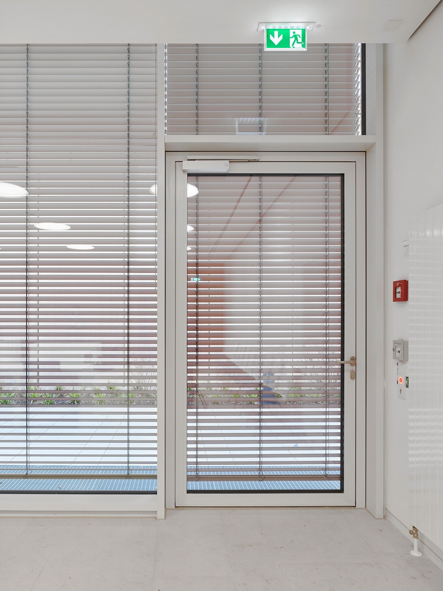 In sensiblen Bereichen wurde der aussenliegende Sonnenschutz mit dem akkugestützten Notraff-Set ergänzt. Das System bewegt die Lamellenstoren im Ernstfall automatisch und sekundenschnell in die obere Endlage. Damit werden Flucht- und Rettungswege schnell freigegeben.