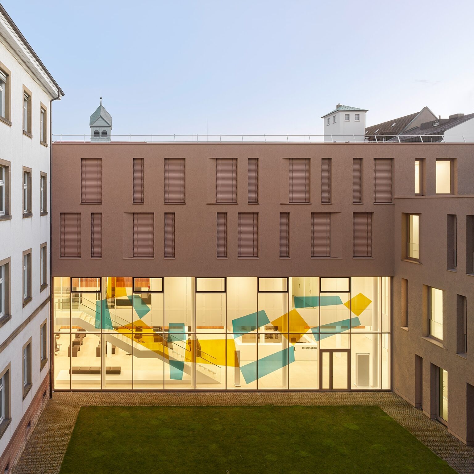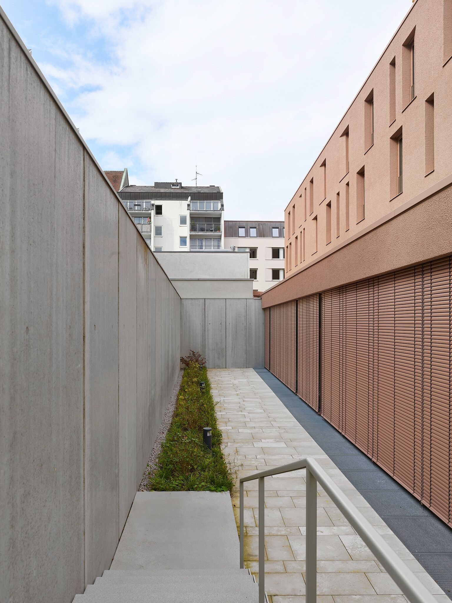 Das Mitte des 19. Jahrhunderts erbaute Bezirksstrafgericht gilt als ältestes Gebäude des heutigen Amtsgerichts. Die drei in die Jahre gekommenen Einzelgebäude im rückwärtigen Hof der denkmalgeschützten Blockrandbebauung sollten rückgebaut und durch einen Erweiterungsbau ersetzt werden. Das Architekturbüro Auer Weber plante einen modernen Bau, der sich harmonisch in den historischen Bestand integriert und gleichzeitig architektonische Eigenständigkeit beweist. Charakteristisch ist der monolithisch wirkende Baukörper mit grobkörniger Putzfassade. In monochromem Porphyrrot gehalten, erhält die Gebäudehülle durch tief eingeschnittene Fenster plastische Tiefe. Als integraler Bestandteil fügt sich die Lamellenstore-Lösung in die Planung ein.
