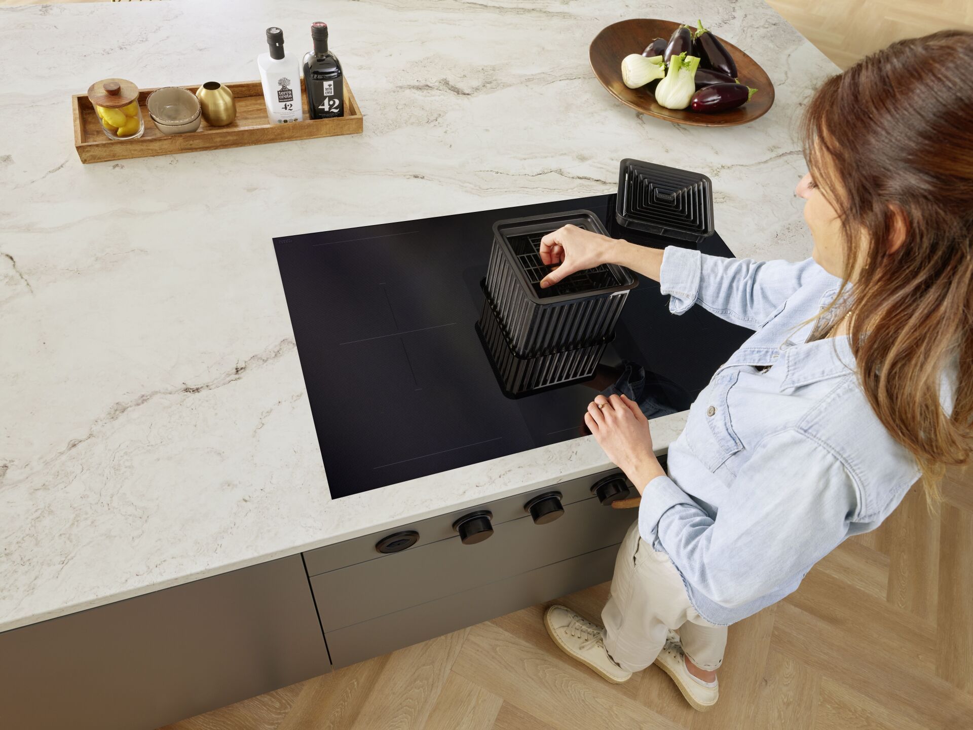 Die zurückhaltende Formsprache erlaubt es der Downline, sich harmonisch in unterschiedliche Küchenkonzepte einzufügen, ohne dabei an Ausdruckskraft zu verlieren. Die vollflächige Oberflächenbedruckung (Surface Protect) sorgt für visuelle Ruhe, schützt das Kochfeld vor Kratzern und sorgt für lautloses Gleiten des Kochgeschirrs.