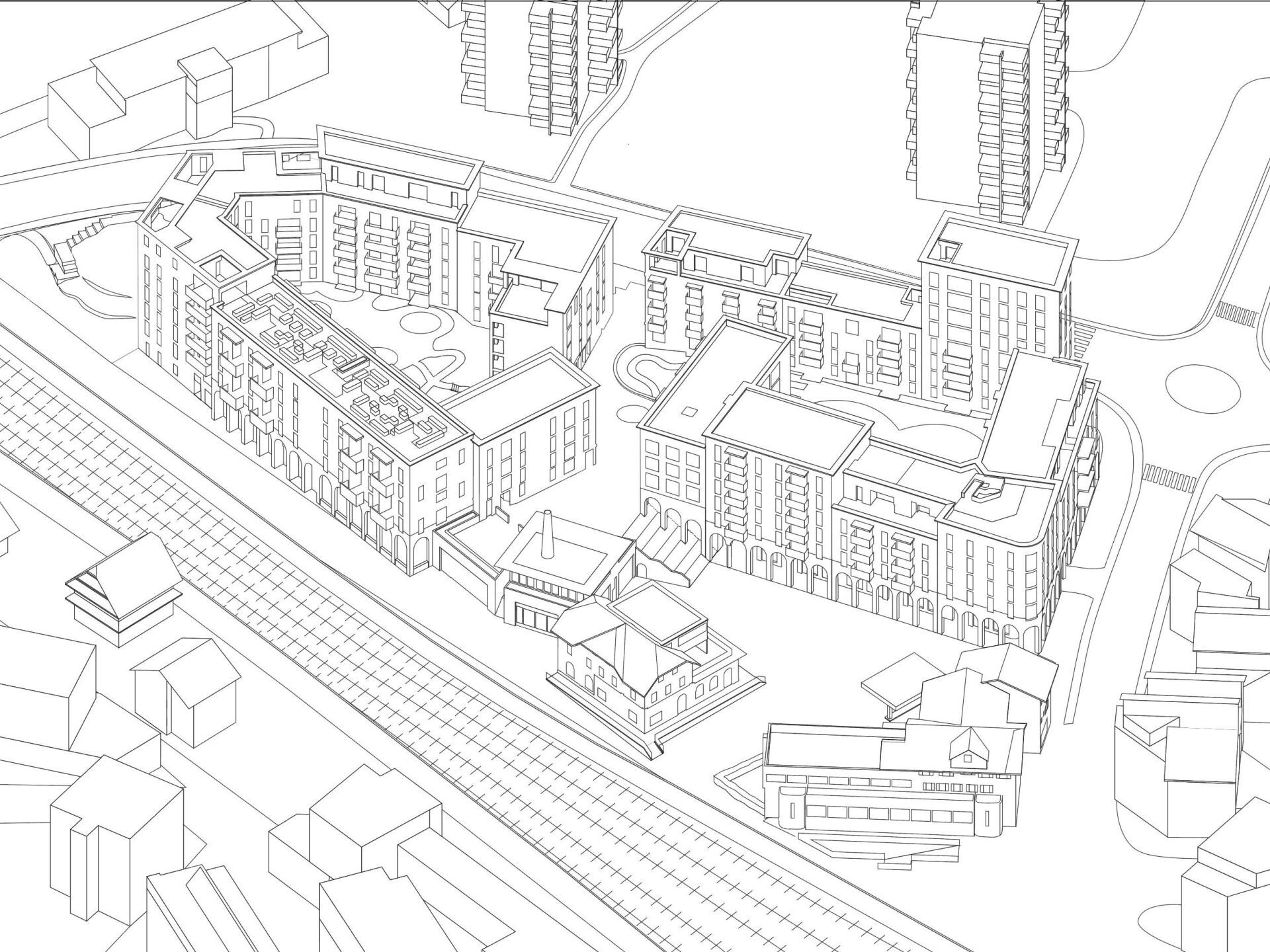 Am meisten überzeugen konnte der Vorschlag des Büros Helsinkizurich, das – um eine einzige Grossform zu vermeiden – eine mittige Durchquerung des zu den Gleisen abfallenden Grundstücks vorschlug. Auf diesen Verbindungsweg sollten sich zwei kompakte – ein Kondensat der umgebenden Siedlungsstrukturen darstellende – Hofrandbebauungen öffnen, bestehend aus aneinandergereihten Häusern. Diese Konstellation erlaubte es, trotz der lärmbelasteten Situation zwischen der vielbefahrenen Chamerstrasse und den starkfrequentierten Bahnlinien ruhige, nach innen abgeschirmten Wohnungen zu bauen. Gleichzeitig sollten die identitätsstiftenden Bestandsbauten der ehemaligen Käserei und des Hotels «Bauernhof» an der Südostecke des Areals erhalten bleiben und zusammen mit den Neubauten einen durch Restaurants und Ladengeschäften belebten Platz schaffen.