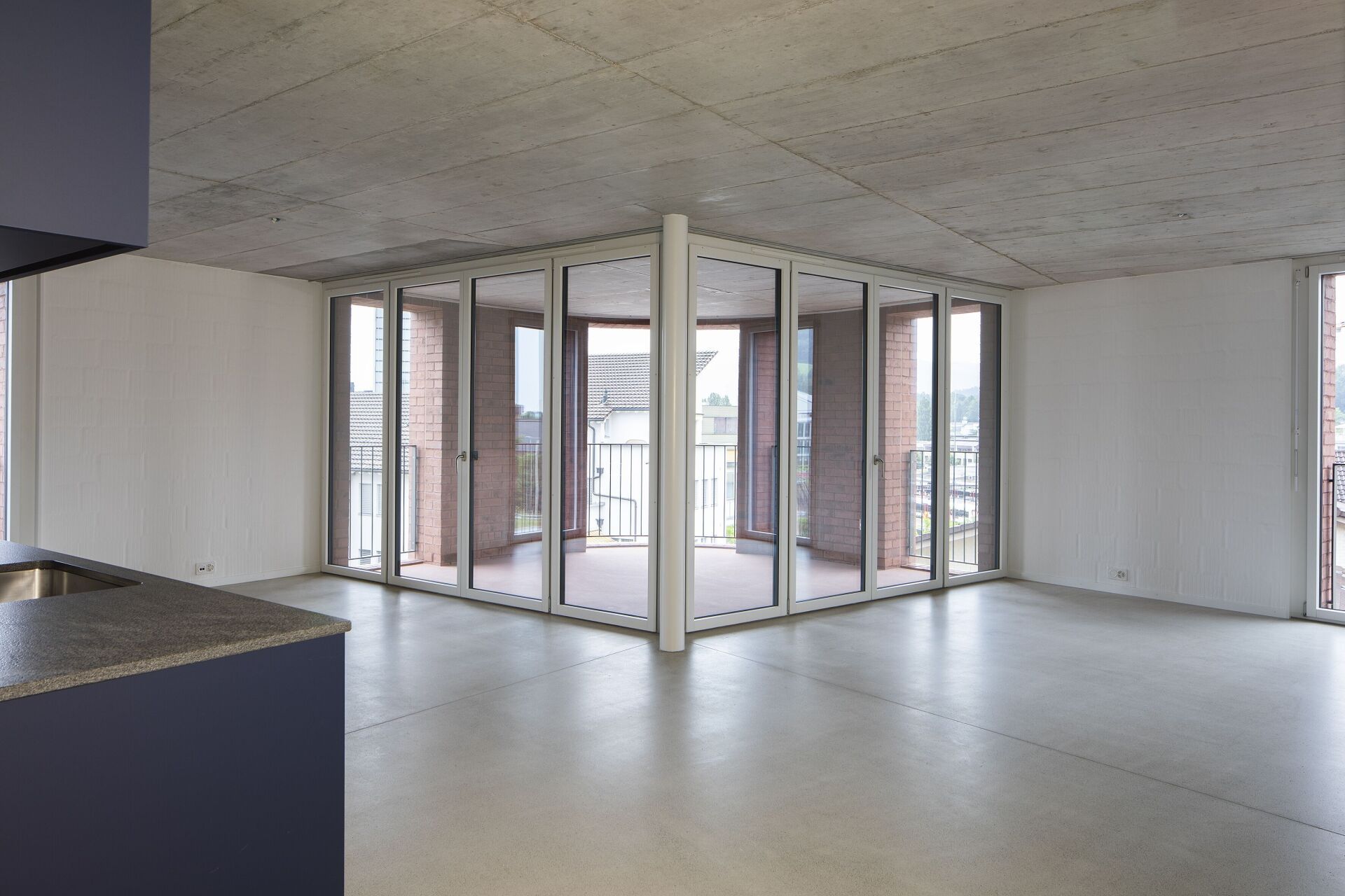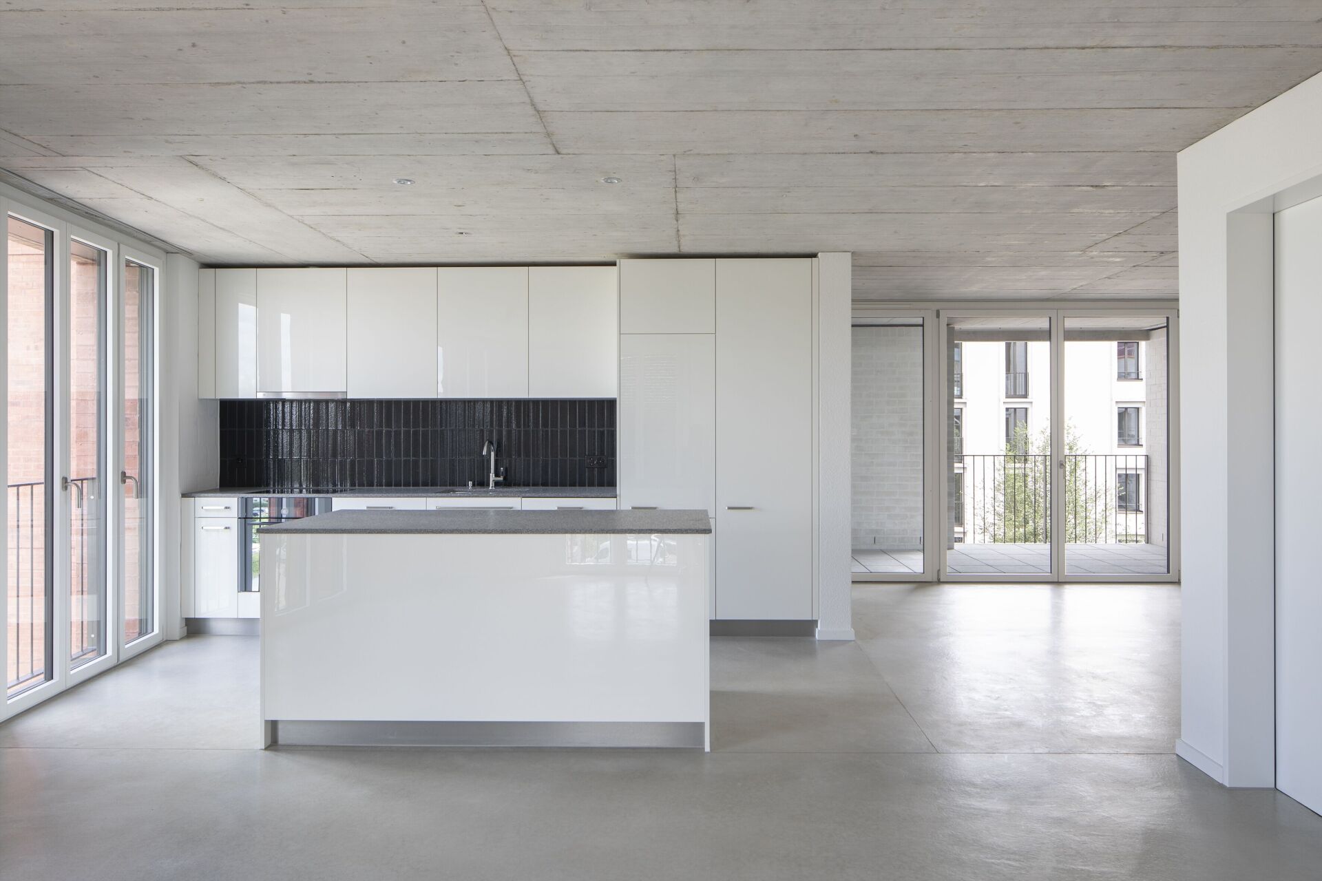 Dem formalen Reichtum der nach aussen rot, nach innen aber weissgrau gehaltenen Fassaden entspricht eine Vielzahl unterschiedlicher Wohnungen. Diese erreicht man vom baumbestandenen Chäsiplatz – dem eine ehemalige, zum Festpavillon transformierte Tankstelle etwas Theatralisches und Fröhliches verleiht – durch Eingänge unter den Arkaden oder über eine breite Freitreppe. Sie führt hinauf zum Foyer, einem langgestreckten, vom Grillpavillon und dem multifunktionalen Chäsisaal gerahmten Platz. Von dort aus gelangt man auf gekurvten, von Hecken und Staudengärten begrenzten Wegen zu den Hauseingängen in den beiden Innenhöfen, aber auch hinunter in die nach dem Konzept von Malene Bach farbig bemalten Velogaragen. Die Künstlerin bestimmte auch die Farbgebung der Leuchten und Geländer in den Treppenhäusern sowie der Wohnungstüren, neben denen die Architekt*innen kleine Nischen schufen, welche die Mietenden individuell mit Objekten schmücken können. Allenthalben spürt man, dass sich eine möglichst breite Mieterschaft in der Siedlung zu Hause fühlen soll. Unter den 126 Wohnungen – die sich immer wieder durch andere Grundrisse, Materialien und Details auszeichnen – finden sich neben zahlreichen Studios hauptsächlich 1,5- bis 4,5-Zimmer-Wohnungen, ausserdem vierzehn 5,5-Zimmer-Wohnungen und neun Alterswohnungen mit zusätzlichen Gemeinschaftsräumen. Während die Mehrzahl der Wohnungen vergleichsweise günstig ist – eine 3,5-Zimmer-Wohnung kostet beispielsweise ab CHF 2000 pro Monat – verlangt man für die Maisonette- und Attikawohnungen annähernd für den Kanton Zug übliche Preise.