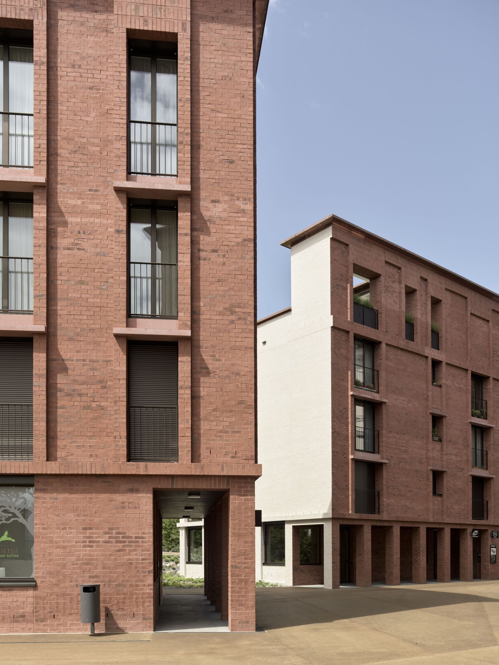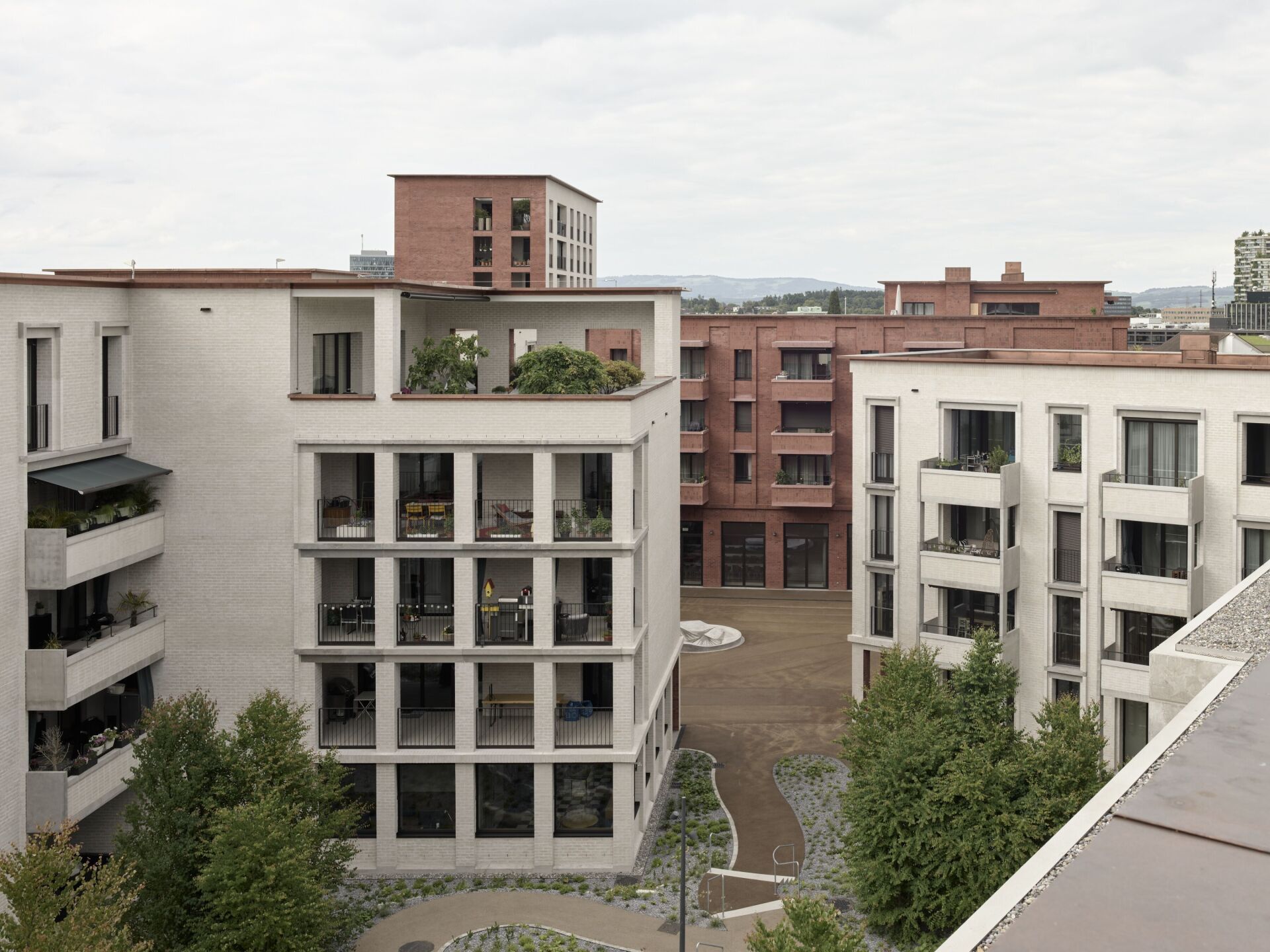 Um den Bewohner*innen die Identifikation möglichst leicht zu machen, wurden die beiden Blockränder in 14 individuell gestaltete Einheiten mit eigenen Eingängen, Fassaden und variierenden Höhen unterteilt. Aussen zeigt sich die Siedlung in warmem Rot, in den Höfen in gebrochenen Weisstönen. | Foto: Ariel Huber