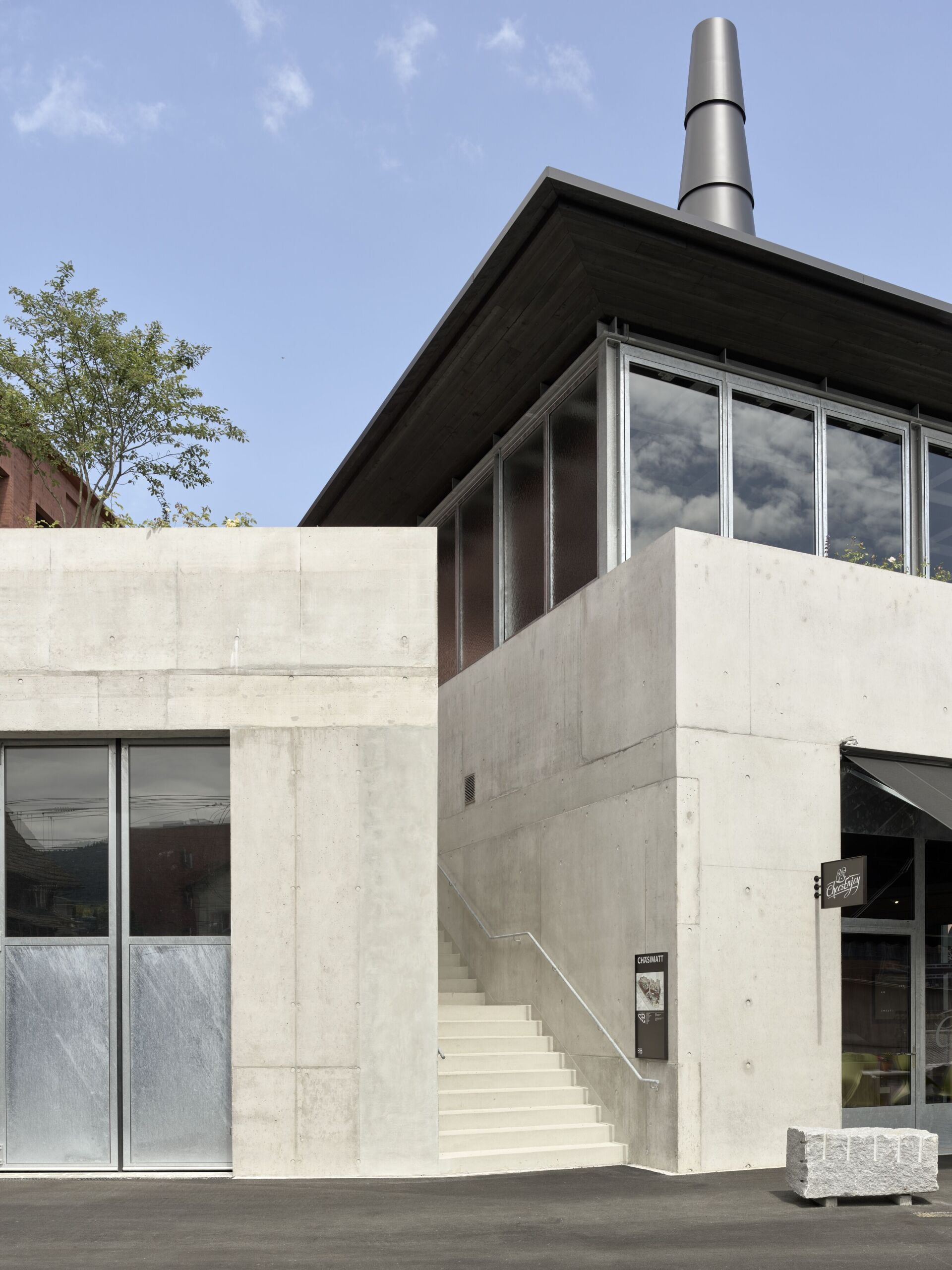 Dieser unbeheizte Verkaufsraum zeugt vom ökologischen Bewusstsein des Büros AMA – genauso wie die Photovoltaikanlagen auf den Flachdächern, die Erdsonden und die Heisswassergewinnung durch Wärmeentzug des Abwassers. Es ist aber nicht die Ökologie, welche die Chäsimatt zu einer aussergewöhnlichen Wohnsiedlung macht, sondern die überzeugenden Bemühungen, sie so lebendig wie möglich zu halten. Umso mehr erstaunt es, dass sie nicht von einer Genossenschaft realisiert wurde, sondern von einer lokalen Immobiliengesellschaft, die bereit war, die Geschäftsräume und Ateliers im Parterre zugunsten einer optimalen Durchmischung der Chäsimatt zu bescheidenen Mieten abzugeben.