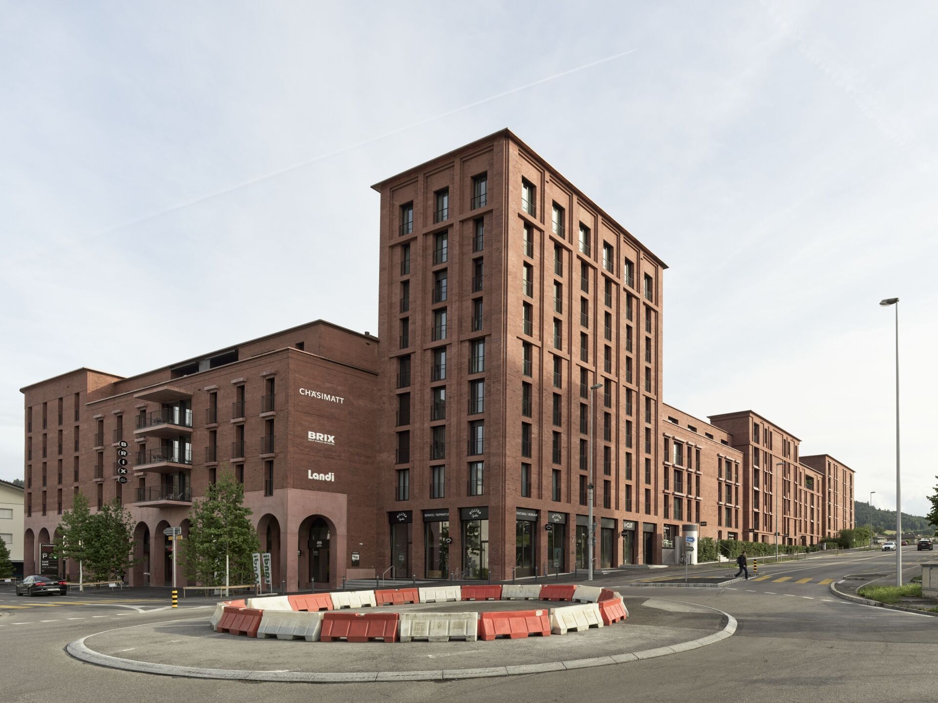 Die Arkaden, deren Decken von der dänischen Künstlerin Malene Bach farblich gestaltet wurden, erinnern an die metaphysischen Stadtdarstellungen von Giorgio de Chirico oder Aldo Rossi. Es fehlt nur noch die Skulptur einer Liegenden von Hans Josephsohn am oberen Ende der zum Foyer hinaufführenden Freitreppe, um das Bild perfekt zu machen. Gegenüber architektonischer Tradition und Geschichte scheint das Büro AMA also keine Berührungsängste zu haben. Das beweist es auch mit der Wahl des rostroten Klinkers für die zweischaligen Aussenfassaden, welcher der Chäsimatt eine einheitliche, gravitätische, mitunter sogar burgartig trutzige Plastizität verleiht. Was man modisch als Retrolook bezeichnen könnte, ist letztlich eine Hommage an die ehemalige Käserei, den ältesten Bau auf dem Gelände. Gleichzeitig ist der Klinker aber auch ein nachhaltiges Baumaterial. Er mag das Bauen verteuern, ist dafür jedoch langlebig und pflegeleicht – zwei entscheidende Eigenschaften in einer durch Bahnstaub und Reifenabrieb belasteten Lage. Schliesslich ermöglichte der Stein die reliefartige Profilierung der Wandflächen mit Lisenen, Fensterumrahmungen und Gesimsen, die auf einem vom Akustikerduo Inès & Fabian Neuhaus aus Basel entwickelten Konzept für die schalltechnische Gestaltung der Fassaden basiert.