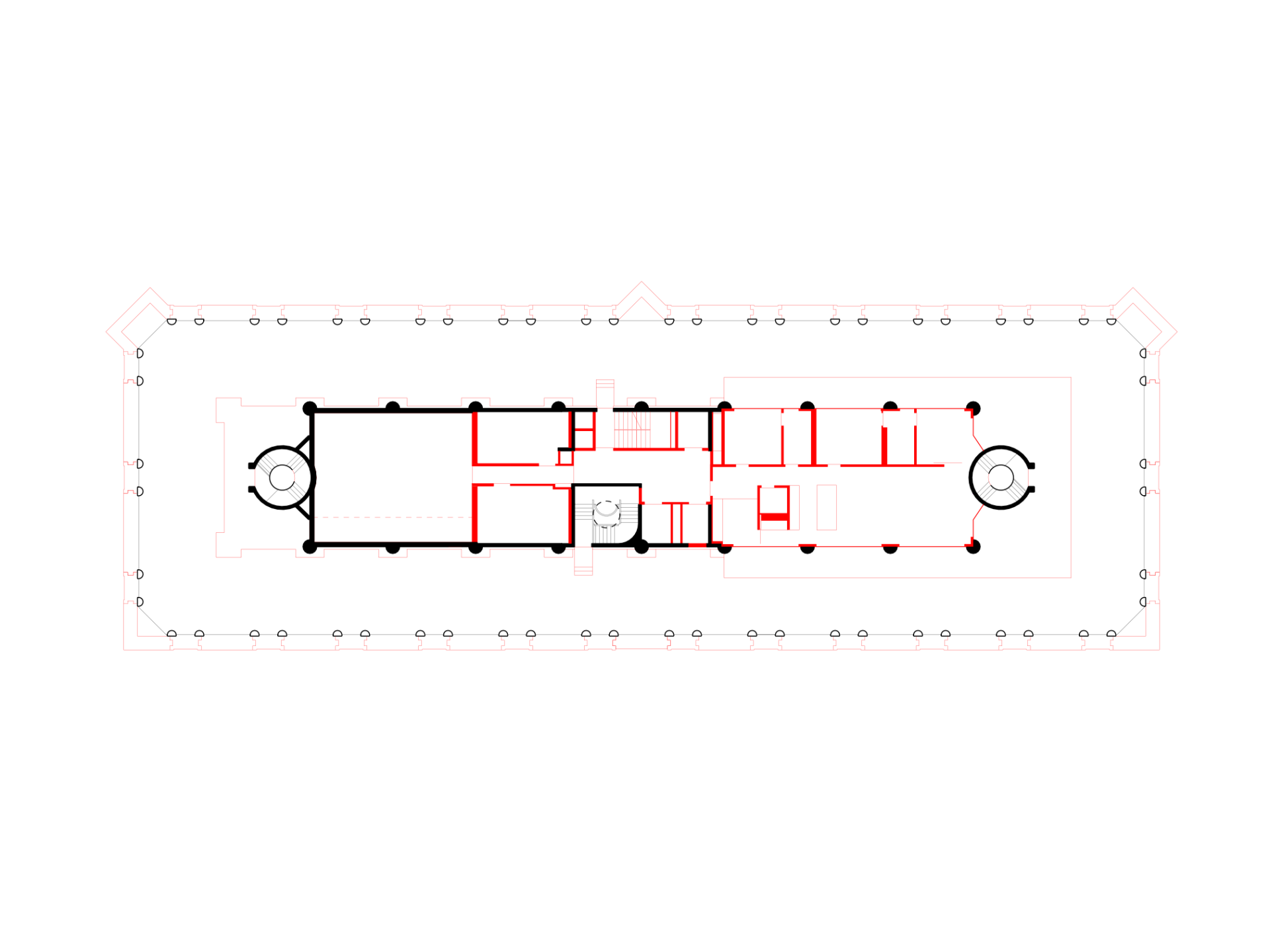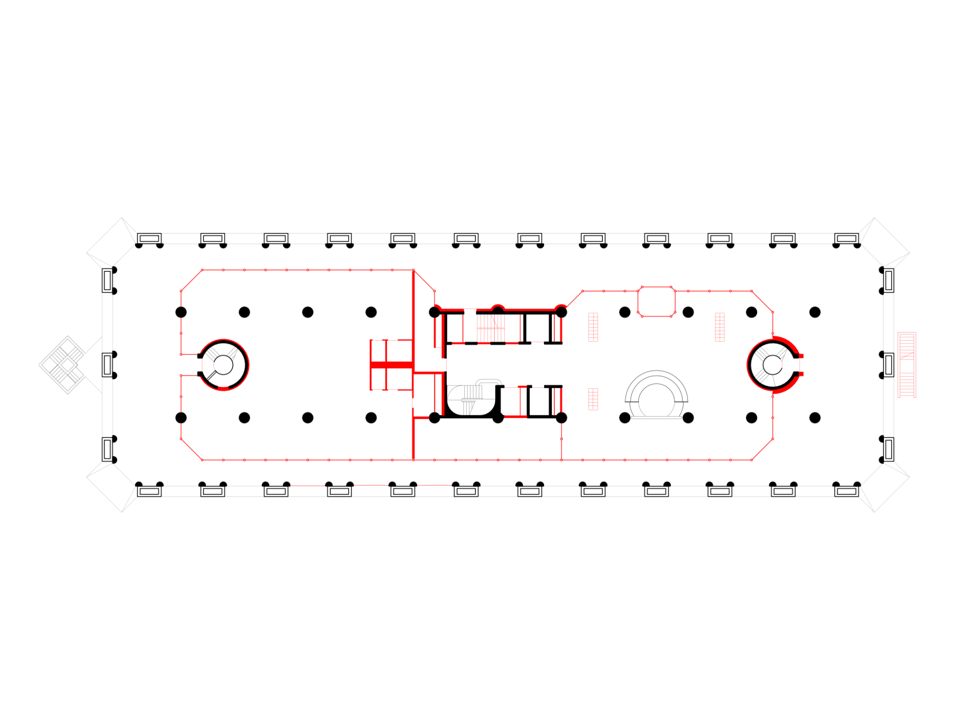 Wenn historisch bedeutsame Bauten saniert werden, gibt es oft Widersprüche zwischen den Anforderungen des Denkmalschutzes und der Einhaltung aktueller Normen. Im Wettbewerb hatten Brauen Wälchli vorgeschlagen, die beiden zylindrischen Fluchttreppenhäuser zu entfernen. Letztendlich mussten diese jedoch erhalten werden, da das Gebäude 2022 – kurz vor Einreichung des Bauantrags – in das Denkmalverzeichnis aufgenommen wurde. Da die 1,1 Meter breiten Stufen zehn Zentimeter zu schmal sind, um den aktuellen Brandschutznormen zu genügen, musste ein neues Treppenhaus angelegt werden. Dazu wurden im zentralen Kern die Schächte des Warenlifts und eines Aufzugs zusammengefasst, die nun Platz für eine neue Treppe bieten, von der man im Erdgeschoss auch direkt nach aussen gelangt. Der Zugang in die zylindrischen Treppenhäuser ist nun leider untersagt; sie wurden damit zu «Technikschächten» herabgestuft.
