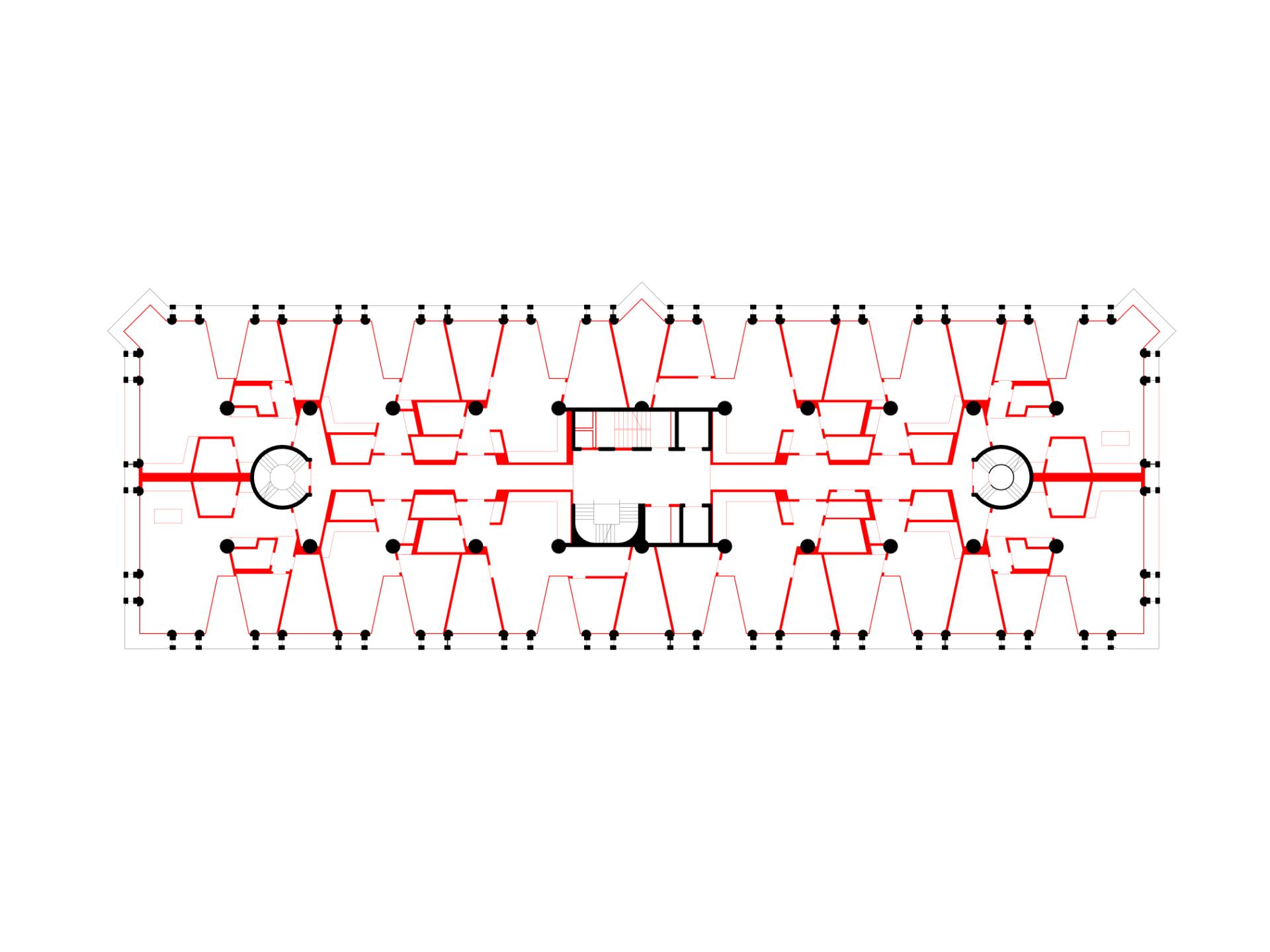 Weil Haustechnik und Erschliessungen auch beim Normandie in Kernen zusammengefasst wurden, können die Innenräume den Bedürfnissen der jeweiligen Nutzung entsprechend flexibel organisiert werden. Beidseitig wird dieser Kern von Betonpfeilern mit einem Durchmesser von einem Meter flankiert – hohl ausgebildet dienen sie zugleich als Schächte für Wasser-, Lüftungs- und Elektroleitungen. Zudem gibt es an beiden Enden des Riegels jeweils einen weiteren Zylinder mit Wendeltreppen, die als Fluchttreppenhäuser dienten.