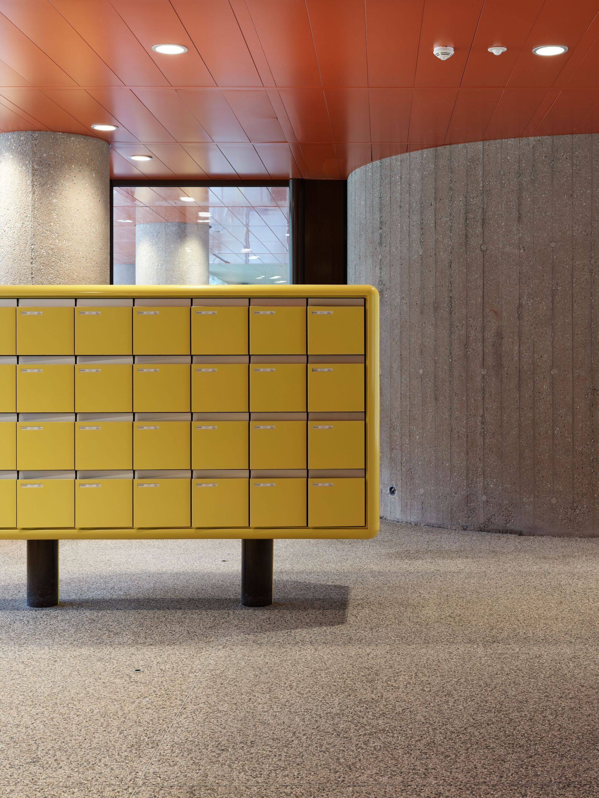 Im Erdgeschoss wurde die Eingangshalle in ihren Originalzustand zurückgeführt. Die Architekt*innen haben den runden, charmanten und nostalgisch anmutenden Empfangstresen erhalten. Dieser harmoniert mit drei neuen Briefkastengruppen und der abgehängten Decke. Deren orange thermolackierte Metallelemente konnten mehrheitlich restauriert und wiederverwendet werden. Die zweite Hälfte des verglasten Erdgeschosses wird als Bürofläche vermietet. Ein Gemeinschaftsraum ist im 1. Obergeschoss vorgesehen und soll das Verbindungselement zwischen Alt- und Neubau werden, dessen 60 Wohnungen noch in diesem Jahr fertiggestellt werden sollen.