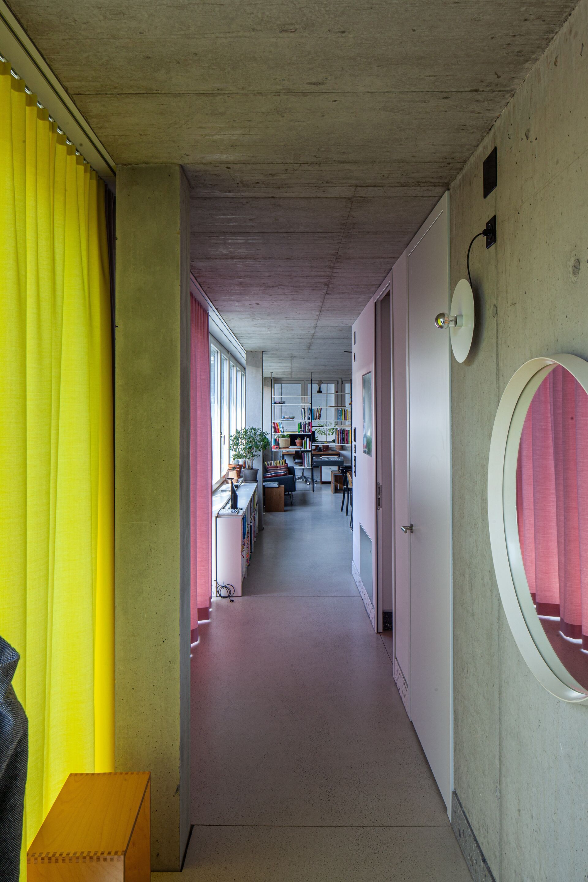 Erdgeschosse sind bei Mehrfamilienhäusern oft eine Knacknuss, vor allem dann, wenn öffentliche Flächen unmittelbar bis an die Fassaden reichen. Für die Macher*innen der Lyse-Lotte war klar: Dort sollen Personen leben und arbeiten, die «die Stadt bespielen wollen». Entsprechend mussten die Bewerber*innen für die doppelgeschossigen Ateliers glaubhaft machen, dass sie dort auch arbeiten und einen gewissen Grad an Publikumsverkehr generieren werden. «Unsere Idealvorstellung war, dass die Stadt in die Ateliers hineinfliesst und die Türen immer offenstehen», erklärt Marion Clauss. Die Architektur setzt für das Ineinandergreifen von öffentlichen und privaten Nutzungen einen idealen Rahmen: Die Erdgeschosse sind offen und werden nur durch Nasszellen, Wendeltreppen und Küchenzeilen dezent zoniert. Die Küchenbereiche können bei Bedarf mit einem Vorhang abgeteilt werden. Im Obergeschoss sind je zwei Schlafzimmer vorgesehen. Die Mieter*innen durften die Einteilung aber nach eigenen Vorstellungen anpassen und haben von dieser Möglichkeit auch Gebrauch gemacht und Wände hinzugefügt oder weggelassen. Die Küchenfronten sind farbig und die Ablagen aus Agglo-Marmor. Dieser fröhlich gemusterte Stein taucht an verschiedenen Stellen des Hauses wieder auf, bildet Fussleisten und bekleidet Wände in den Bädern – in weiss, grau, schwarz und rot.