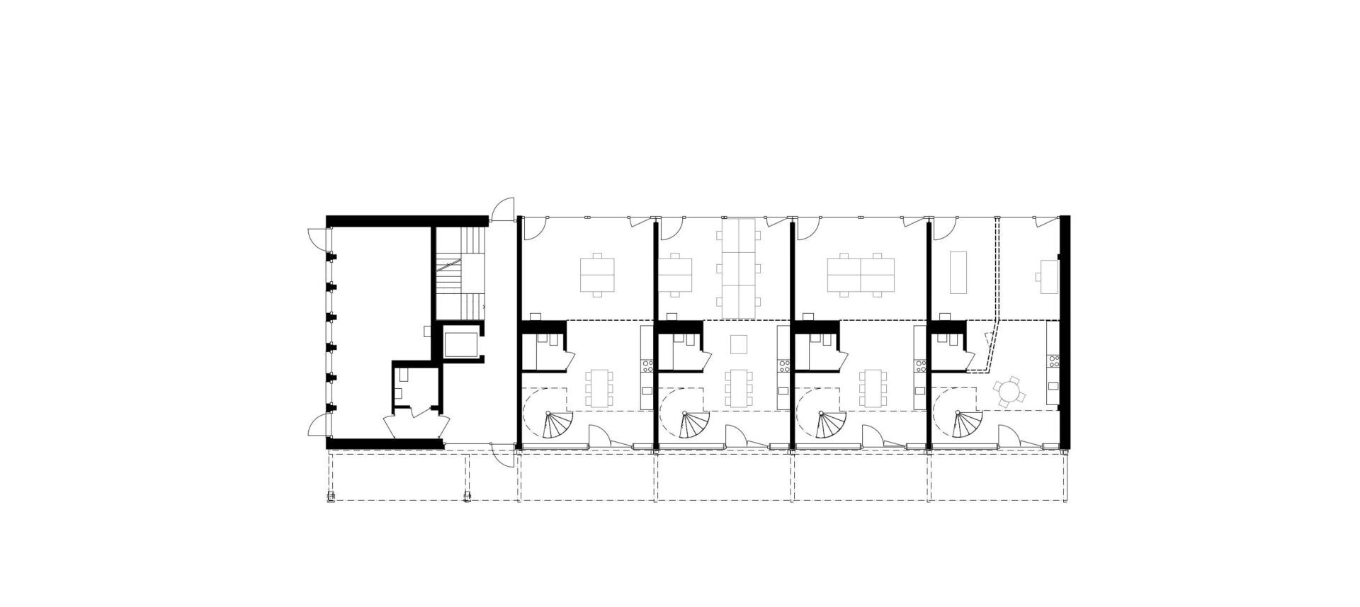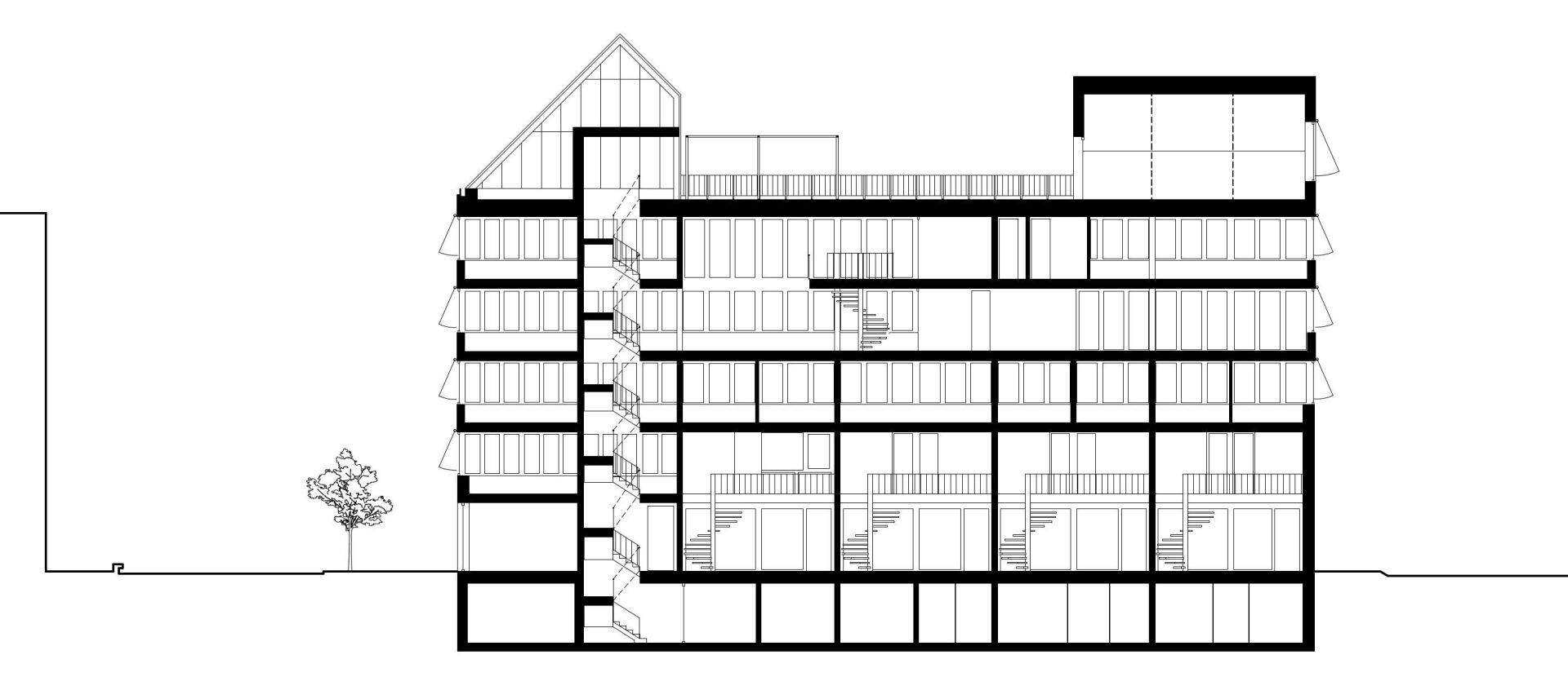 Im Erd- und 1. Obergeschoss liegen doppelgeschossige Ateliers und ein Gewerberaum. Im 2. Obergeschoss wurden Wohnungen für ältere Menschen angeordnet und in der 3. und 4. Etage gibt es Familienwohnungen. Zudem wurden besondere Einheiten wie ein Gästezimmer und ein -studio sowie ein Gewächshaus eingeflochten. Die verschiedenen Wohnungstypen sollten ursprünglich durch unterschiedliche Fensterformate und farbige Profile von aussen ablesbar sein. Zudem sollte der Gewerberaum eine Reihe schlanker Fenstertüren mit Rundbogenabschluss erhalten. Aus Kostengründen wurde die Polychromie jedoch verworfen und auf verschiedene Grautöne eingedampft. Auch die Bögen und zwei Rundfenster an der Westfassade fielen dem Rotstift zum Opfer und die Fensterformate wurden so stark wie möglich vereinheitlicht.