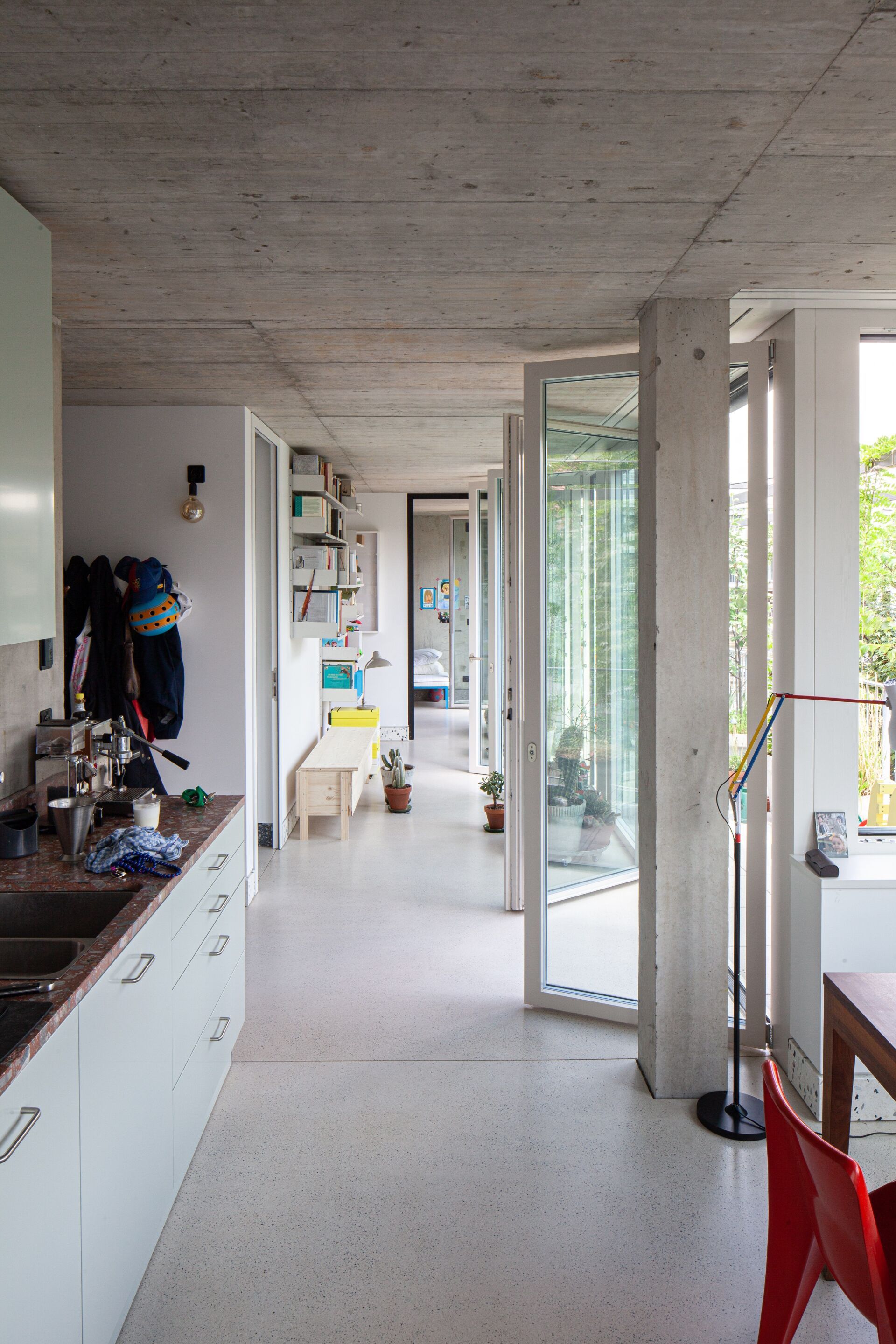 Das 3. und 4. Obergeschoss nehmen Familienwohnungen ein. Eine Maisonettewohnung wurde zwischen vier Etagenwohnungen eingeflochten. Zur Erschliessung wurde eine Wohnhalle erfunden. Man erreicht dieses zweigeschossige Foyer über das Treppenhaus. Noch ist sie unmöbliert, aber schon bald wird es einen grossen Tisch geben, an dem die Bewohner*innen zusammen essen könnten oder die Kinder gemeinsam Hausaufgaben machen. Schon jetzt nutzen die Kids die Halle rege und spielen dort – nicht immer zur Freude der anderen Bewohner*innen – mit Flummis oder Fussball.