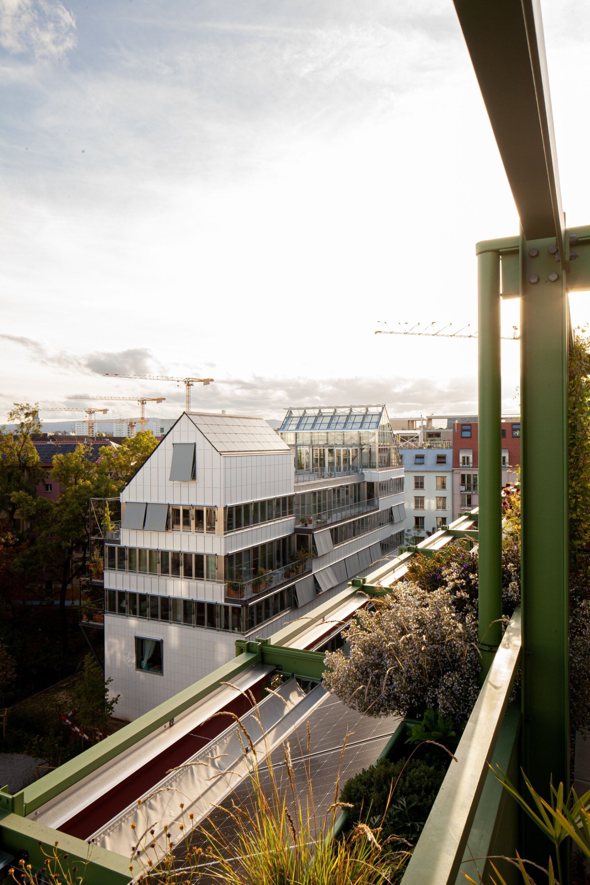 Das Dach der Lyse-Lotte ist ein Ort für alle. Es gibt eine grosse Gemeinschaftsterrasse mit einer Pergola, ein Gewächshaus und ein Studio, das jeweils für ein Jahr vermietet wird und aktuell von Mitarbeitenden des Theaters Basel genutzt wird. Das Glashaus soll indes nicht nur der Überwinterung von Balkonpflanzen und zur Zucht von Gemüse dienen; es ist zugleich ein Multifunktionsraum. Noch erscheinen Dachterrasse und Gewächshaus eher ungenutzt, entzünden jedoch sofort die Fantasie. Vielleicht entdeckt die Hausgemeinschaft bald – nachdem sie der Idylle ihrer eigenen Balkone und Terrassen überdrüssig wird – welche grossartigen Partys man dort schmeissen könnte?