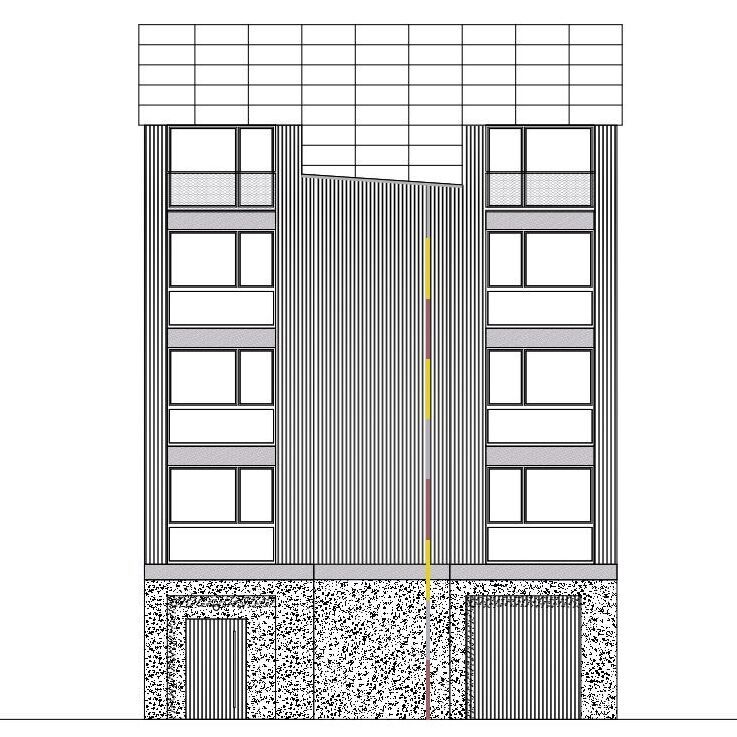 Hofseitig ist die Fassade abgetreppt und weicht auf den zwei oberen Geschossen zurück. Über den Balkonen, die sich über die gesamte Breite des Gebäudes erstrecken, ragen filigrane Stahlrohre in die Höhe. Die Brüstungen bestehen aus industriellen Pressrosten. Mittels Sonnensegeln oder Pflanzen können die Bewohner*innen ihre Aussenräume individuell bespielen, wodurch die Fassade einen lebendigen Ausdruck erhält. Im Hof zeugen Reste alter Mauern davon, dass dieser Raum einst überbaut war. Er gehörte zu einer Spenglerei, die sich noch heute bis in den Sockel des Wohnhauses ausdehnt. Aufgrund der Modernisierung reduzierte sich die Fläche der Werkstatt jedoch. So konnte der Hof zum gemeinsamen Garten für Mieter*innen und Angestellte umgestaltet werden.