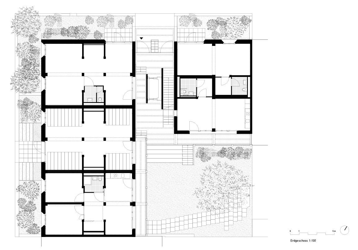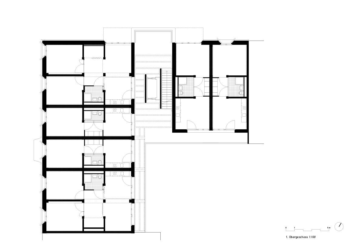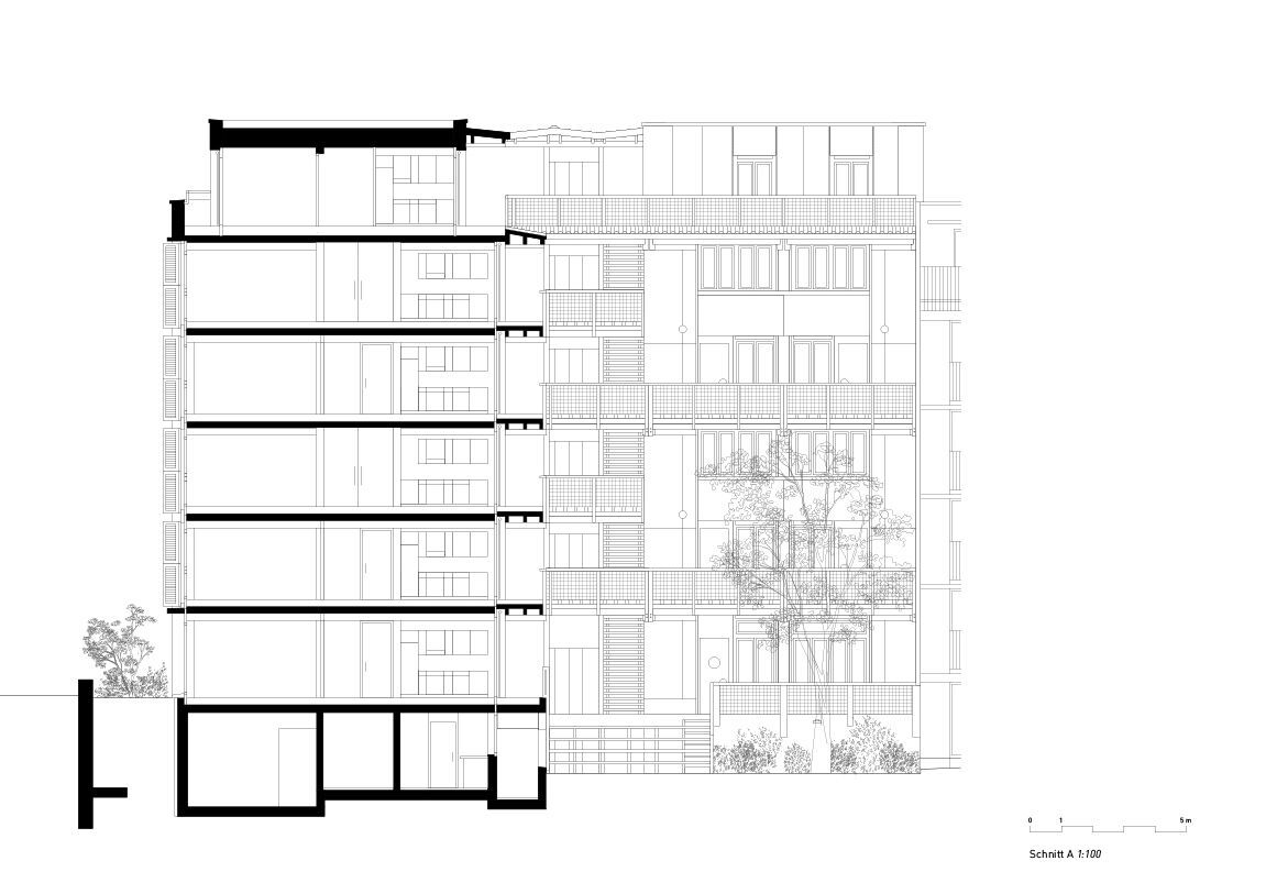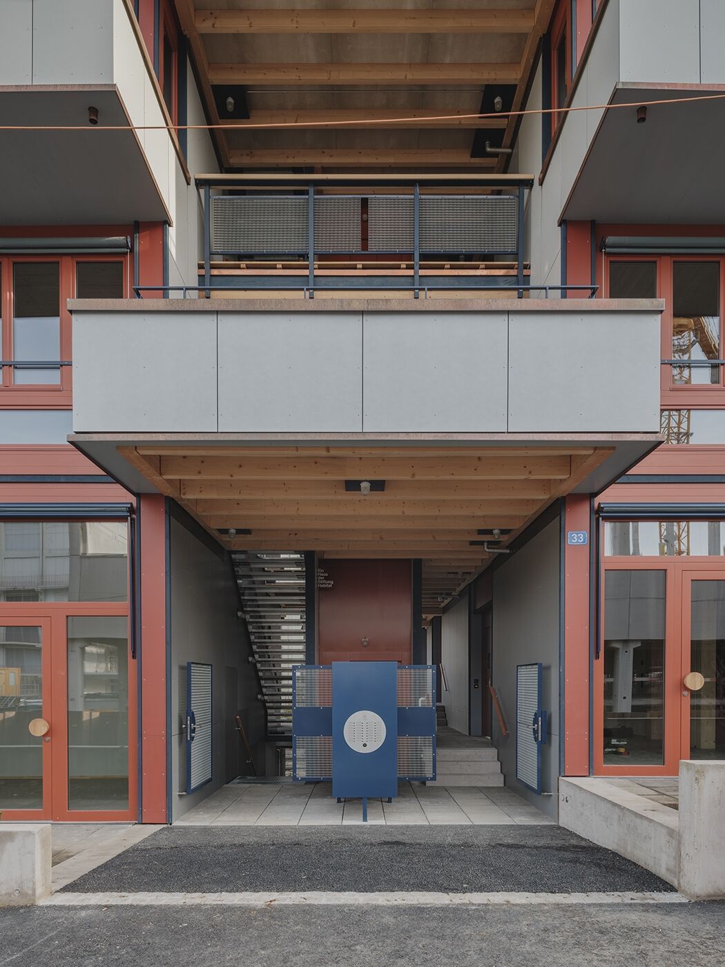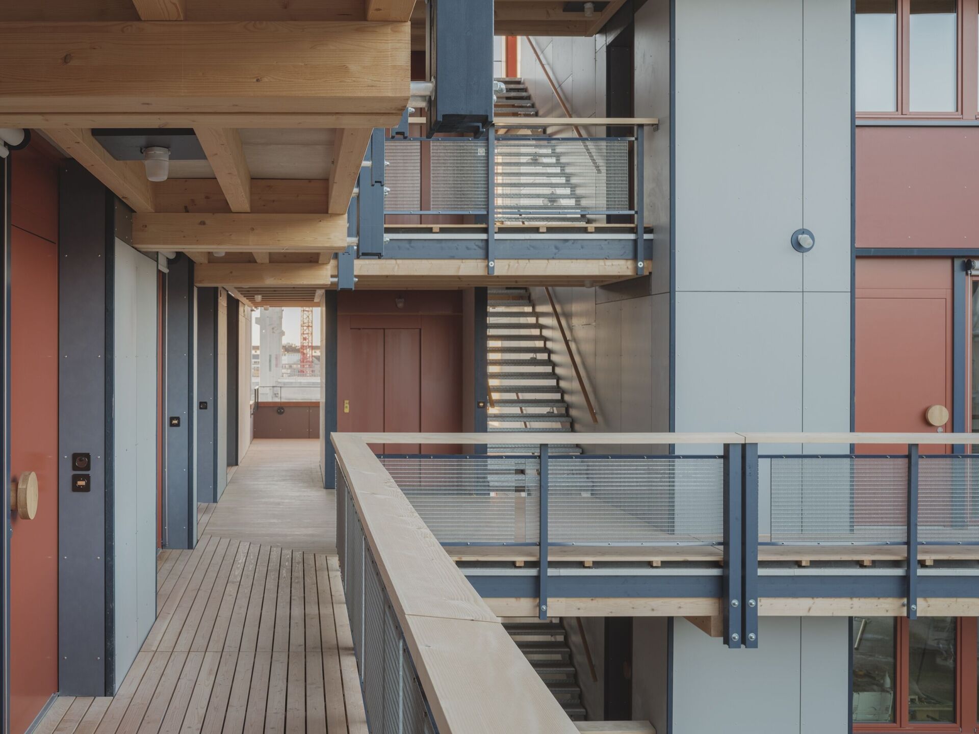 Das offene Treppenhaus mit dem Lift im Kern auf der adressgebenden Seite ist überaus grosszügig. Die Wohnungen sind von dort aus über Laubengänge erreichbar. «Für uns ist es kein Treppenhaus, sondern ein öffentlicher Raum, ein Begegnungsraum», betont Marc Loeliger. «Deshalb haben wir die Terrassen auch mit einer fix montierten Möblierung bestückt, damit man sich hier treffen kann.» Auch bautechnisch macht das offene Treppenhaus Sinn. So liess sich der Liftschacht aus Holz realisieren. «Und für den Wohnflächen- sowie für den Energieverbrauch muss es so nicht angerechnet werden.» An diesem Dezembertag ist es relativ kühl hier. Aber im Sommer, wenn die Bewohner*innen auf den Laubengängen ihre Abende geniessen, wird daraus ein lebendiger halböffentlicher Begegnungsraum.