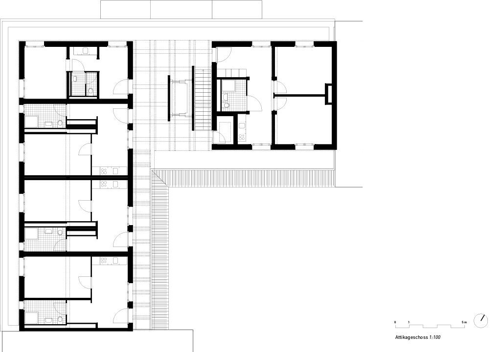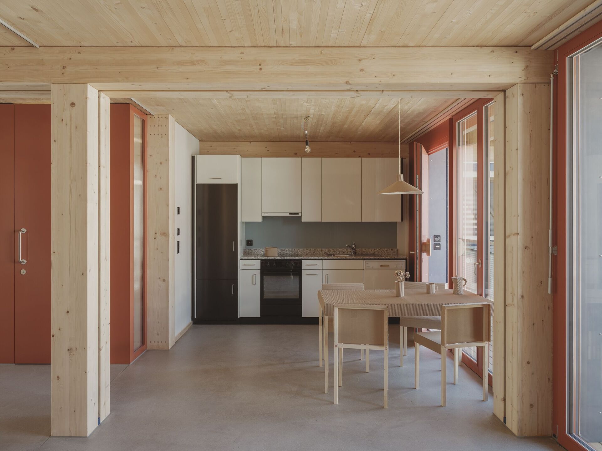 Die 27 Einheiten – bestehend aus 1,5-Zimmer-, 3,5-Zimmer- und zwei 4,5-Zimmerwohnungen – sind klein und sehr kompakt. Die kleinste 1,5-Zimmerwohnung misst lediglich 31 Quadratmeter. Dank der intensiven und vielseitigen Auseinandersetzung mit Wohnräumen an sich und bei anderen Projekten haben Loeliger Strub für die kleinen Wohnungen Lösungen gefunden, die einzigartig sind. So ist – ähnlich wie beim Wohnhaus an der Waffenplatzstrasse in Zürich – das Bad zwischen Wohnraum und Schlafzimmer in einer grossen Wandnische untergebracht. Diese lässt sich dank zweier raumhoher und -breiter Flügeltüren, um 90 Grad geöffnet, in einen Baderaum verwandeln. Gleichzeitig schliessen sie so Ess- und Schlafbereich ab und das Bad ist barrierefrei. Sind die Flügeltüren indes geschlossen, entsteht ein Gang zum Schlafzimmer. Und hält man sich im Wohn- oder Schlafbereich auf, sind die Flügeltüren zugleich das Mittel, um die Räume voneinander zu trennen.Die Wohnungen haben Bodenheizungen, die von Fernwärme gespeist werden. Ursprünglich war geplant, für den Bodenbelag einen Lehmguss zu realisieren, der sich am Ende seiner Lebensdauer rezyklieren liesse. Aus verschiedenen Gründen konnte dies nicht durchgehend umgesetzt werden. Die Küchen stammen aus einer Genossenschaft in Zürich. Als Kontrast zu den Fronten in gebrochenem Weiss haben Loeliger Strub neue hinzugefügte Elemente in einer dunkleren Farbe gehalten. Dies stört nicht, sondern stellt eher einen ästhetischen Mehrwert dar. Die gestrichenen Wandverkleidungen zeigen die Schrauben, die nicht ganz bündig in die Wand hineingeschraubt sind, weil sonst das Fermacell herausgedrückt würde. Das war anfangs nicht Absicht, hat sich im Bau so ergeben, aber wird so ebenfalls zu einem sichtbaren Zeichen für die Demontierbarkeit. Die Brettstapeldecken in einem Hausteil sind neu, im anderen sind es wiederverwendete Balkenträger. «Die Decken waren eine grosse Herausforderung», erzählt Marc Loeliger. «Wir haben mit Zirkular verschiedene Spuren verfolgt, um eine passende Quelle, auch Mine genannt, zu finden.» Das Tunnelholz kam, wie bereits erwähnt, nicht zur Anwendung, weshalb teilweise neue Decken eingebaut wurden. Was in den Wohnungen wie überall im Gebäude sichtbar bleibt, ist die Holzkonstruktion aus Stützen mit Unterzügen in einem vorgegebenen Raster. Massivholzwände, welche die Nasszellen begrenzen, garantieren mit stahlverstärkten Stützen an deren Enden die Queraussteifung des Gebäudes. So liesse sich alles bis auf die Steigzonen auf den Rohbau zurückbauen und dank der modularen Bauweise eine ganz andere Raumaufteilung realisieren.