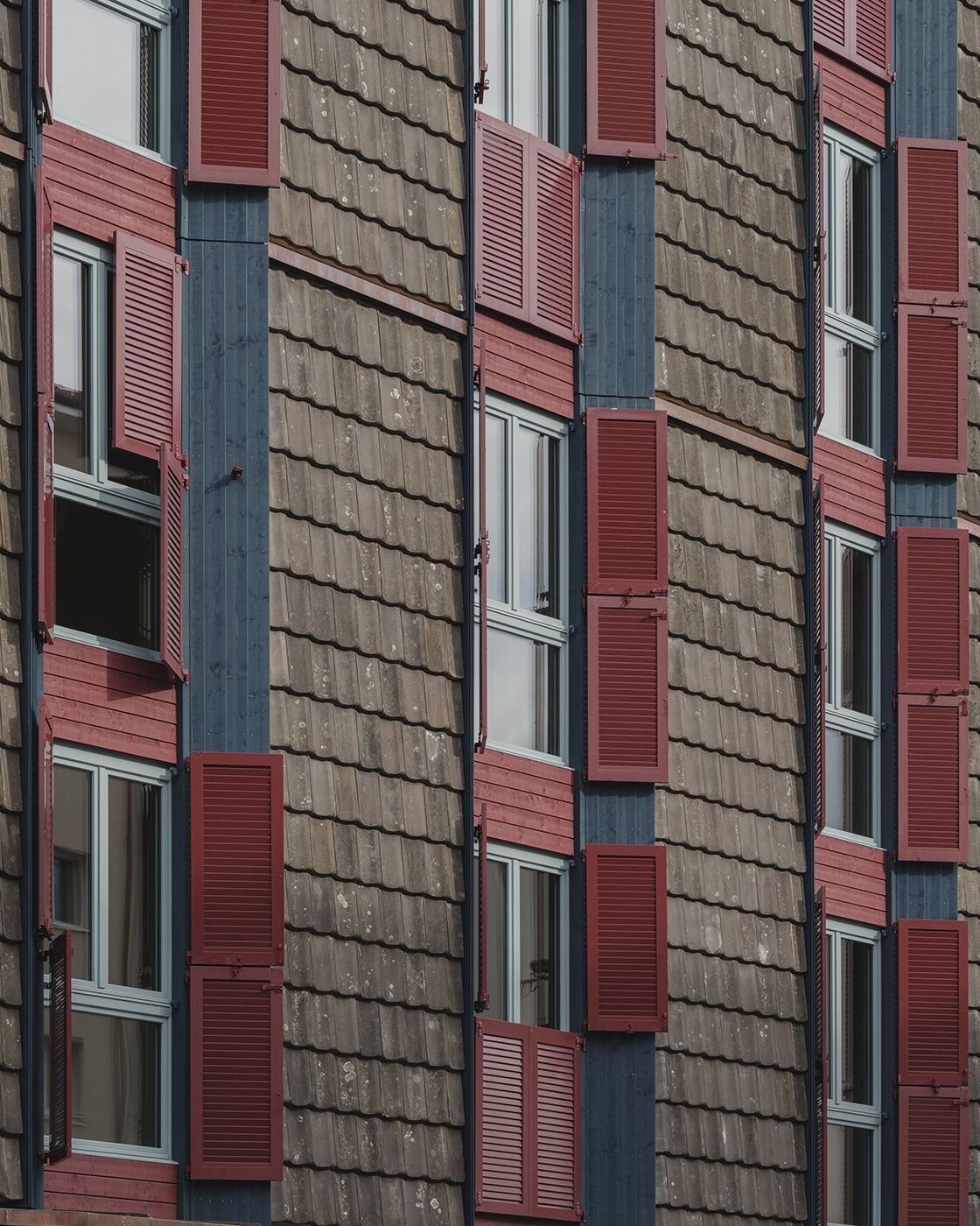 LysP8 steht an der Ecke der Weinlager- zur Lothringerstrasse. Die zu den Strassen hin ausgerichteten Fassaden sind bestimmt durch einen Wechsel von kleinteiligen und grosszügig wirkenden Elementen. Grosszügig ist das offene Treppenhaus nach Norden Richtung SBB Areal mit seinen weit auskragenden und damit einladend wirkenden Gemeinschaftsbalkonen. Feingliedriger sind die eigentlichen Fassaden mit den Fenstern, bei denen etwas Besonderes auffällt: Die weinroten Metallfensterläden sind doppelt übereinander angeordnet und lassen sich wie Stalltüren unabhängig voneinander öffnen in einer leicht geknickten Fensterlaibung. Und da sind die gebrauchten Dachziegel als Fassadenmaterial mit ihrer spezifisch graubraunen Patina. Im Erdgeschoss sind es terracottafarbige, frisch wirkende Ziegel, aber auch sie sind Reuse. Ziegel an der Fassade kennt man eigentlich nur von Bauernhäusern im Zürcher Weinland. Hier dienen sie seit alters her als Witterungsschutz. Beim LysP8 sind sie ein erster, aber sehr sprechender Hinweis darauf, dass bei diesem Gebäude mit einer Vielzahl an wiederverwendeten Materialien gearbeitet wurde: Die Gitterroste der Brüstungen und die Küchen sind ebenfalls Reuse. Die Eternitplatten an den Wänden des Treppenhauses stammen aus einem Produktionsüberschuss. Loeliger Strub haben die Auflage der Stiftung Habitat so ernst genommen, dass das Projekt immer wieder an die Verfügbarkeit und Beschaffenheit der erhältlichen Bauteile und Materialien angepasst werden musste. «So wollten wir zum Beispiel Tunnelholz für die Decken verwenden und hatten das Material schon in die Planung einbezogen und begonnen einzusammeln, als sich herausstellte, dass das Holz mit einem Pilz befallen war. Und bei den Eternitplatten reichte die Menge nicht aus, um sie im Treppenhaus und als Fassadenmaterial zum Innenhof im selben Ton zu haben.» So wurde eine Farbabfolge entwickelt, die vor Ort nur bei genauerem Hinsehen auffällt. Die Geschichte des Wohngebäudes ist also eine des Zusammentragens, Ansammelns und Integrierens in ein gestalterisches Gesamtkonzept, das kontrastreich, aber zugleich so weit wie möglich harmonisch aufeinander abgestimmt ist und nicht in Einzelteile zerfällt.