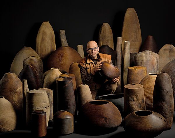 Ernst Gamperl inmitten seiner Holzgefässe aus dem «Lebensbaum-Projekt», Foto: Bernhard Spöttel