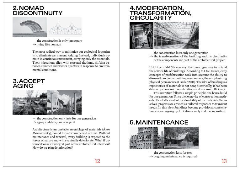 Der Abschnitt «Permanente» widmet sich Strategien der Dauer. Massive Konstruktionen, insbesondere aus Stein, fungieren als strukturelle Reserven, die Nutzung aufnehmen, verändern oder speichern können. Dauer bedeutet hier nicht Stillstand, sondern die Fähigkeit, Wandel auszuhalten. Ergänzt werden die Kapitel durch Essays, Matrizen und Referenzen, die Begriffe wie Alterung, Wartung oder Lebensdauer systematisch einordnen und die Entwürfe theoretisch rahmen.