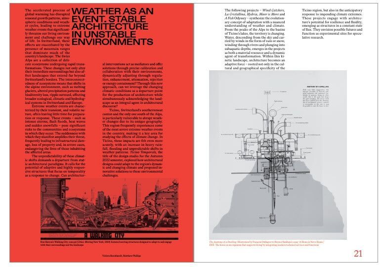 Nach einer einleitenden Rahmung gliedert sich der Band in drei Teile: «Temporale», «Circolare» und «Permanente». Statt Typologien ordnet diese Dreiteilung die Projekte nach ihrem Umgang mit Zeit und Bestand. Im Abschnitt «Temporale» untersuchen die Projekte Architektur unter instabilen Bedingungen – Wetterereignisse, Dürre, Starkregen oder saisonale Nutzung prägen die Entwürfe. Temporäre Wasserspeicher, mobile Infrastrukturen oder offene Konstruktionen reagieren auf klimatische Extreme und akzeptieren Veränderung als Ausgangslage.