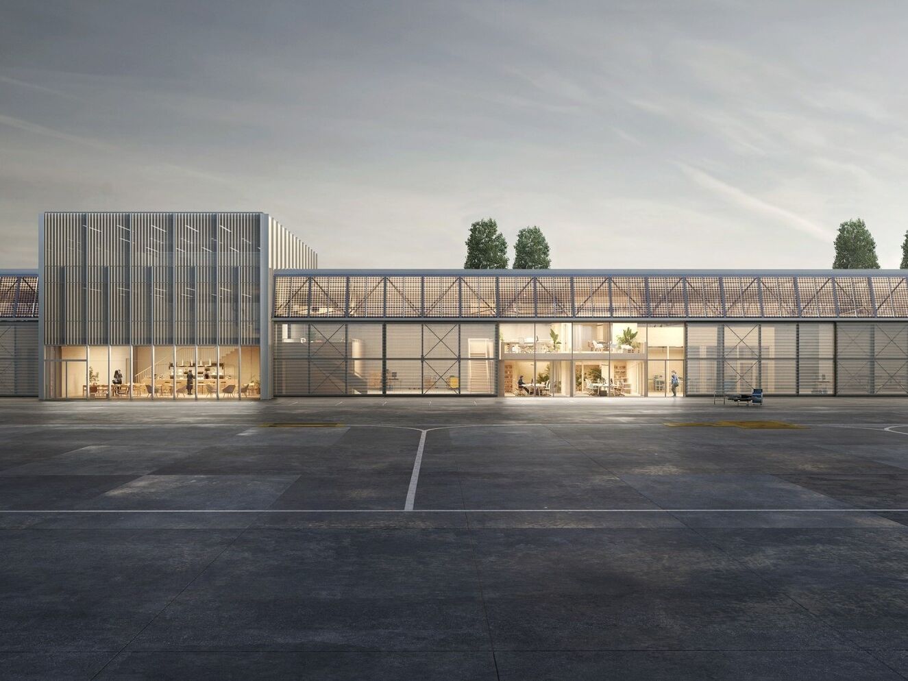 Der Hangar ist 150 Meter lang, 20 Meter breit und 8,4 Meter hoch und befindet sich am nördlichen Rand des Flugplatzes. Durch das stark geneigte Stehfalz-Metalldach entstehe der Eindruck eines höhlenartigen Raums, heisst es weiter in der Mitteilung. Verstärkt werde dieser Effekt durch die freiliegenden Dachbinder, die das Dach tragen. Die Fassade des Hangars ist mit mehreren Schiebetüren versehen, die sich über die gesamte Höhe des Hangars erstrecken und direkt auf das Vorfeld führen. Dadurch werden laut KCAP die Grenzen zwischen Innen und Aussen fliessend ineinander übergehen und eine vielseitige Nutzung des Raums ermöglichen. Bis zu 200 Forscher werden dereinst im Hangar arbeiten. Die Räume dafür werden mittels drei zweistöckiger «Cluster» mit Glas- und modularen Holzelementen geschaffen, die jeweils über eine offene obere Ebene und eine geschlossene untere Ebene verfügen. Glastrennwände sorgen dabei für einen ungehinderten Blick auf den Flugplatz und die umliegende Landschaft.