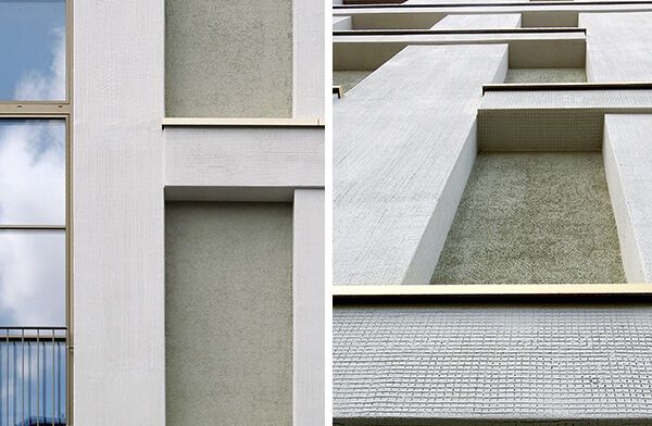 Die Steinwollplatten «K6 034» sind auf die Holzrahmenkonstruktion geklammert und mit dem Einbettmörtel mit Armierungsgewebeeinlage beschichtet. Darauf folgt der Auftrag des Modellierputzes Mineral für die Besen- und Rechenstruktur. Mit dem Rauputz Mineral und dem Nadelroller wurden die zurückspringenden Fassadenoberflächen gestaltet. Der zweischichtige Silikatfarbanstrich schliesst den vollmineralischen, hydroaktiven und «eco-1»-zertifizierten Systemaufbau in sich ab.