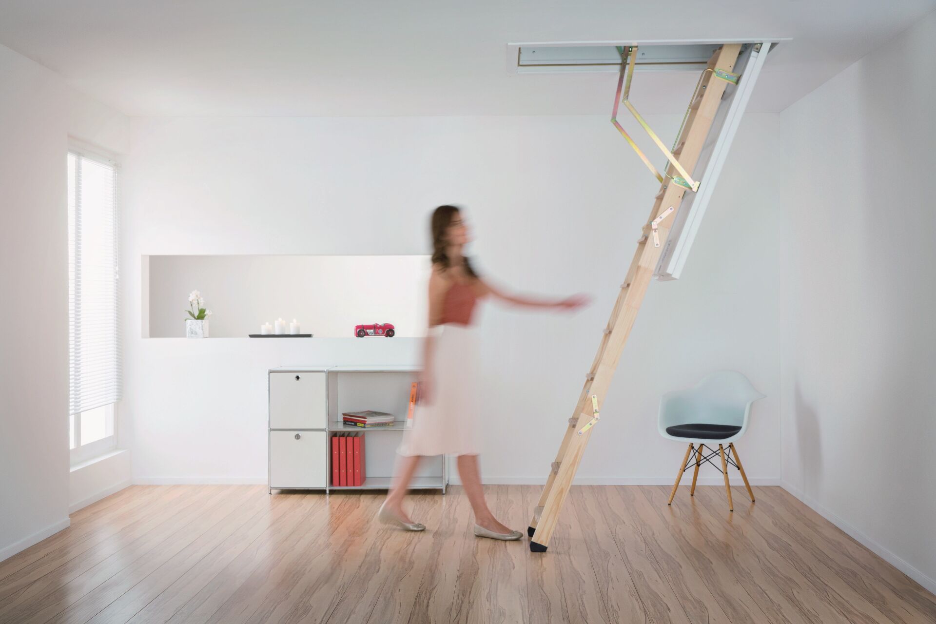 Die Treppenlösung ist als Scherentreppe in Aluminium oder als Holzleiter wählbar. Alle Treppen werden in solider handwerklicher Qualität gefertigt.