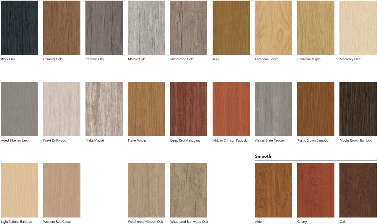 20 Designs mit holzähnlicher Struktur, 2 Designs mit der Optik von bewittertem Holz und 3 Designs mit glatter Oberfläche