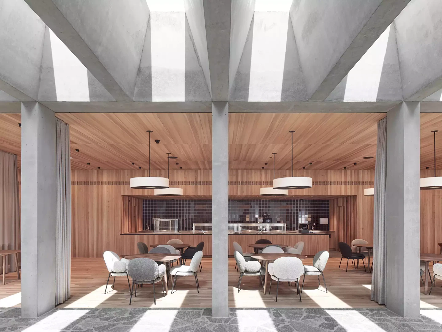 Aus unserer Sicht ist es neben den agierenden Personen die Summe aller Elemente, die zum Gelingen dieses Bauwerks geführt haben. Die verwendeten Materialien Beton und Holz, Mauerwerk und Putz, Stein und ja: Licht vollenden die Raumsequenzen und entwickeln ungewohnte Wohlfühlatmosphären.