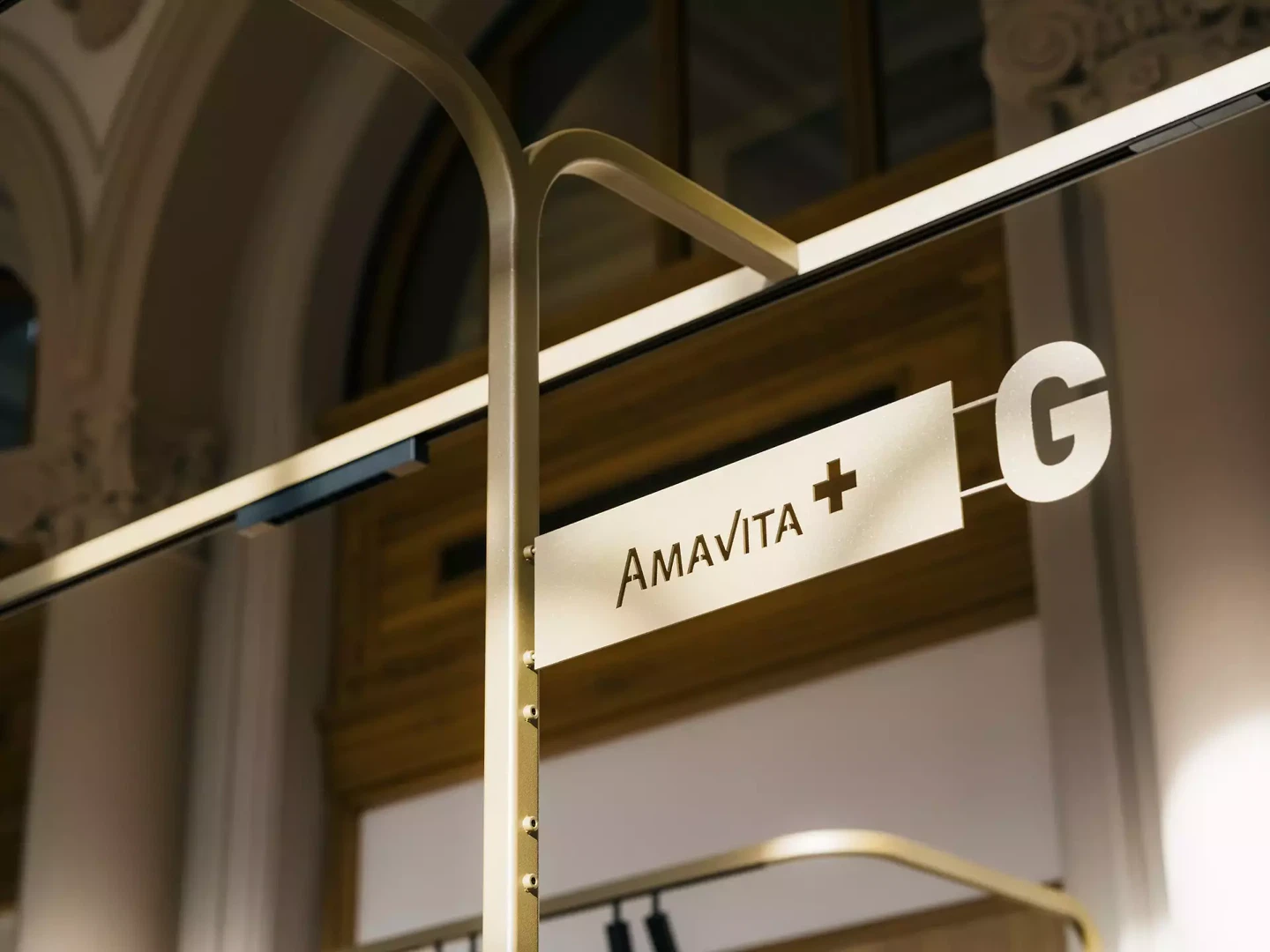 In dem fast sieben Meter hohen Raum der Wandelhalle wirken die neu entwickelten Amavita-Verkaufsmöbel stimmig mit der historischen Architektur. Hochwertiges Eichenholz steht als zentrales Material im Raum und bringt Wärme, Harmonie und Wohlbehagen als angenehmen Kontrast zum kühlen Naturstein der Böden und Wände. Die weichen Formen und elegant geschwungenen Elemente der Verkaufsmöbel treten als Einheit mit der Architektur auf. Das Tageslicht, das durch die grosszügige Südfassade in den Raum gelangt, spielt mit den Materialien, Farben und Formen und erzeugt ein Licht- und Schattenspiel. Künstliches Licht wird gemischt diffus und gerichtet eingesetzt, akzentuiert die Ware, erzeugt plastische Tiefe und vervollständigt das räumliche Ensemble.
