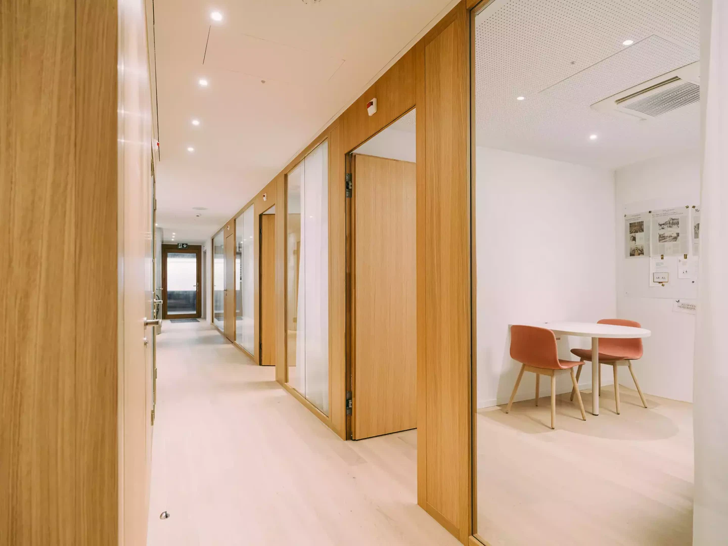 Im 3. Obergeschoss des Gebäudes befindet sich auf weiteren rund 300 Quadratmetern das Backoffice der Apotheke. Für eine wohnlich angenehme Atmosphäre wird auch hier das Eichenholz als zentrales Material eingesetzt, und im Altbauteil werden die Farben und Materialien ganz bewusst auf die alte und geschützte Bausubstanz abgestimmt.