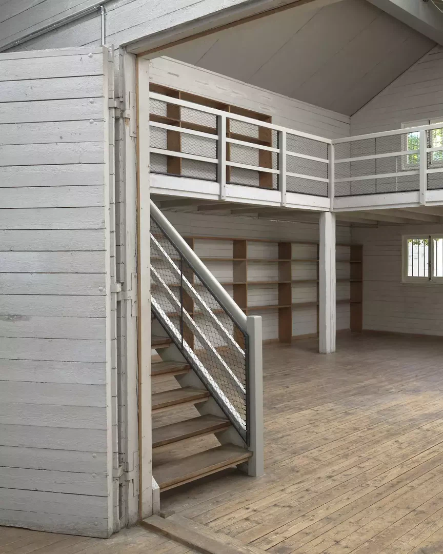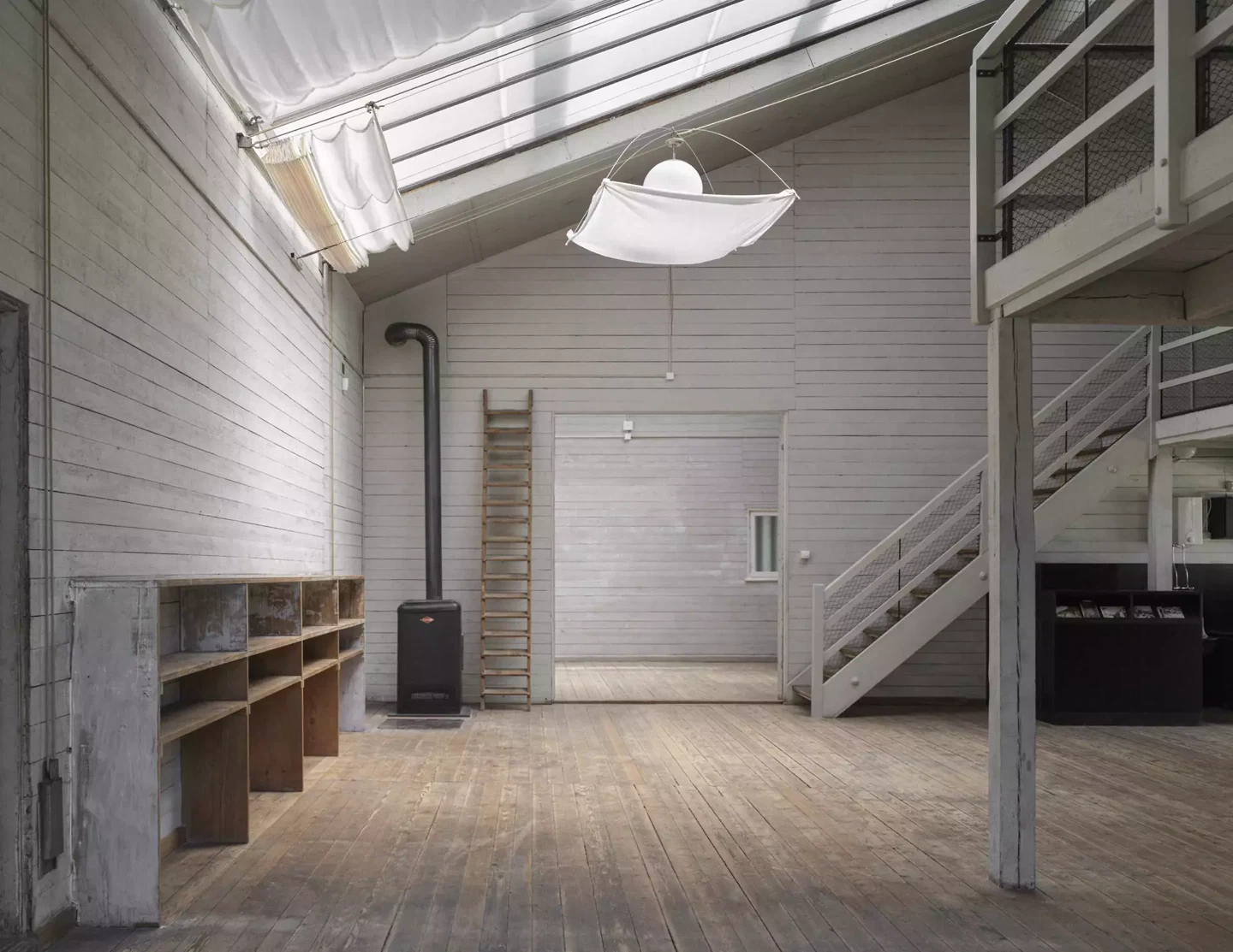 Die Punktfundamente wurden mit einem zusätzlichen, umlaufenden Betonriegel auf Terrainniveau miteinander verbunden, um Einzelsetzungen zu minimieren. Zudem wurden alle Punktfundamente zusätzlich mit umweltverträglichen Bodeninjektionen unterfangen, um das Setzungsverhalten grundsätzlich stärker zu unterbinden. Einzelne Stahlunterzüge im Hohlraum zwischen Atelierboden und Terrain stabilisieren das Gebäude zusätzlich. Im Innern wurde ein neues Empfangsmöbel am Eingang platziert, welches die bisherige, frei zusammengestellte Situation ordnet und eine erkennbare Informations- und Anlaufstelle erzeugt. Die Geländer der Galerie wurden behutsam erhöht und mit feinen Netzbespannungen ergänzt, um heutige Normen und Richtlinien zu erfüllen. Die Seilzüge der erneuerten Textilverschattung des zentralen Oberlichts liessen wir von einem Meilemer Bootsbauer instand setzen. Als erkennbarster Neueingriff haben wir im ehemaligen Aussenlager einen neuen hölzernen Zwischenboden eingefügt, um Skulpturen zukünftig ohne Niveauunterschied zwischen Lager und Ausstellungsbereich verschieben zu können. Zudem wurde im Aussenlager eine neue, abschliessbare Lagerbox eingebaut und die bestehenden Lagergestelle mit abschliessbaren Türfronten ergänzt. Zum Witterungsschutz wurden zudem Plexiglasstegplatten entlang der äusseren Bretterhülle montiert. Wir haben alle spezifischen Eingriffe auf ihre notwendigen Bereiche begrenzt. Neues wurde in Absprache mit der städtischen Denkmalpflege konstruktiv, materiell und farblich der optischen Vorgabe des Bestands angepasst. Unsere Eingriffe zeigen ein konsequentes Weiterbauen im Sinne des Originals, subtil verwoben und mit zunehmendem Gebrauch nur noch auf den zweiten Blick erkennbar. Wem es nicht auffällt, bestätigt uns in unserem Vorgehen.