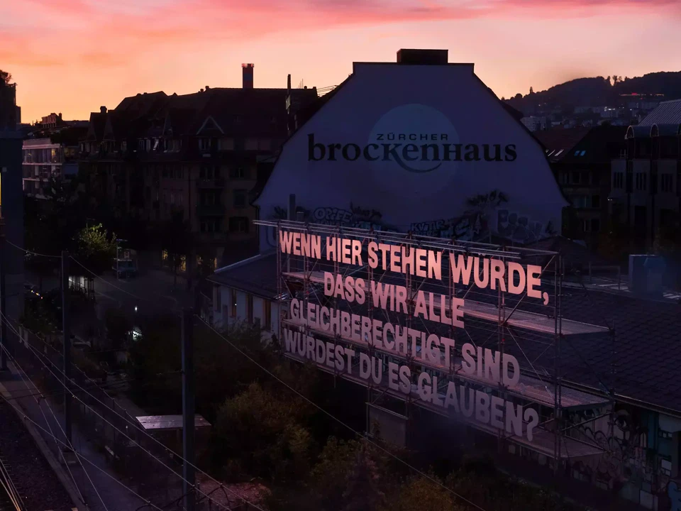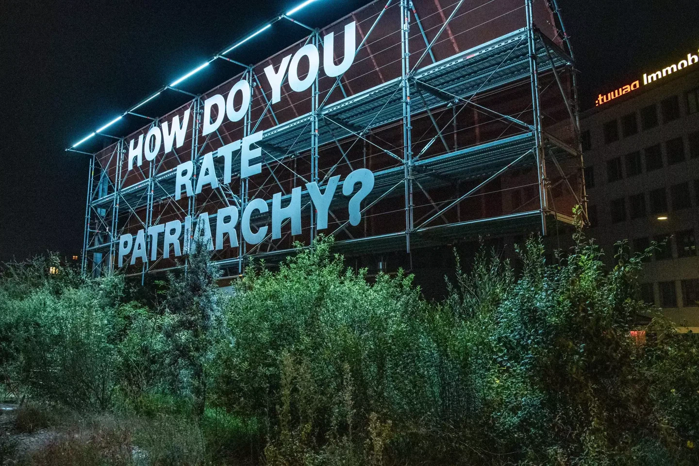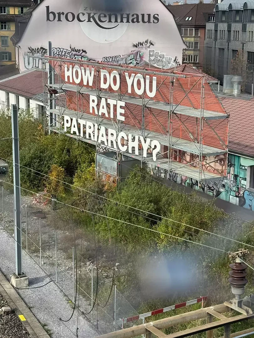 Die Gleise glänzen in der untergehenden Sonne. Unter den Füssen bremsen die Züge auf der Einfahrt zum Hauptbahnhof Zürich. Am Ende des Negrellistegs, in leuchtend weissen, meterhohen Buchstaben, steht: «How do you rate patriarchy?» Die Worte hängen auf einer monumentalen Stahlstruktur am Gleisfeld – einer acht Meter hohen und achtzehn Meter breiten feministischen Anzeigetafel.