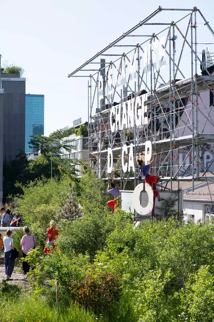 Die Kunstinstallation BILLBOARD geht auf eine Idee der Architektin Nelly Pilz aus dem Künstlerduo WILLIPILZ zurück. Realisiert wurde sie vom Verein Créatrices.ch, der sich seit 2017 dafür einsetzt, das kreative Schaffen von Frauen sichtbar zu machen und bestehende Normen in Architektur und Gesellschaft zu hinterfragen. Der Verein arbeitet ohne kommerzielle Absicht, aber mit viel Energie und klarem Ziel: Strukturen zu verändern, Diskurse zu öffnen und weibliche Perspektiven im öffentlichen Raum zu stärken. Inspiriert von dieser Haltung bin ich in diesem Herbst selbst Teil des Vorstands geworden. Was mich besonders beeindruckt, ist die Unmittelbarkeit, mit der hier Ideen umgesetzt werden. Bei Créatrices.ch ist der Weg von der Vision zur Tat kurz; Planung und Realisierung geschehen mit professioneller Sorgfalt, aber zugleich mit einer Spontaneität und Offenheit, wie sie in etablierten Institutionen selten ist. Die Arbeitsweise ist kollektiv, offen für Kooperationen und geprägt von einer Haltung des gemeinsamen Erforschens. Die Gruppe stand bereits hinter der vielbeachteten Intervention FrauMünsterhof21 (2021), mit der fünfzig Jahre Frauenstimmrecht in der Schweiz gefeiert wurde mit Performances und Diskussionen auf dem Zürcher Münsterhof. (Siehe dazu auch: Arc Mag 2022–6, S. 170–173. In diesem Jahr gewann der Pavillon einen Arc Award). Wie damals dient auch im Fall von BILLBOARD ein Baugerüst der Firma Kamber Gerüste aus Olten als temporäre, modulare und wiederverwendbare Konstruktion.