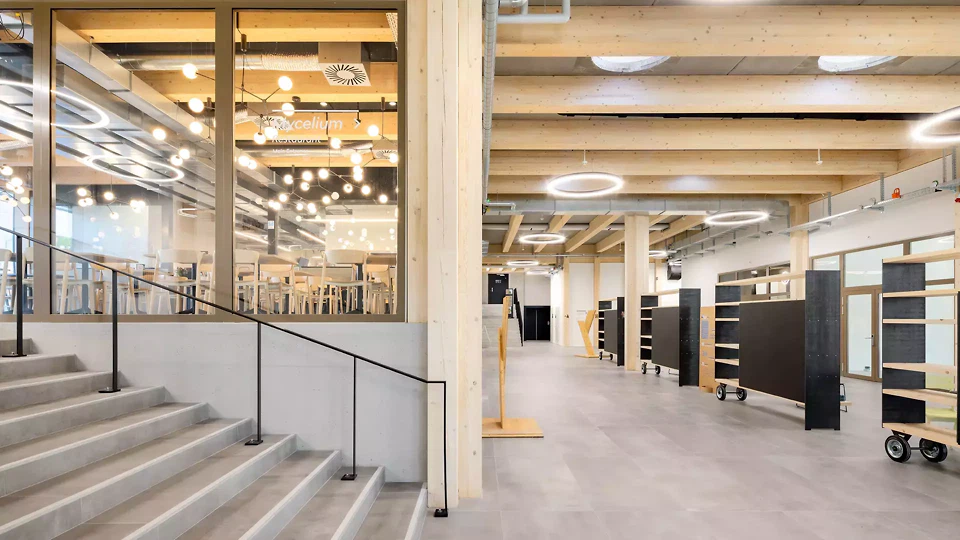 Das Erdgeschoss des Gebäudes B schliesst direkt an das bestehende Gebäude A an. Diese Annäherung um den Kern des Bestandsgebäudes ermöglicht eine effiziente Vernetzung der Erschliessungen. Rund um den öffentlichen Raum befinden sich Haupteingänge, Restaurant und Aktivitäten. Auf der Seite der ehemaligen Gleise nutzen die Konferenzräume und Prototypenwerkstätten im Erdgeschoss die Geländedifferenz und profitieren dadurch von grosszügigeren Raumhöhen. In den Obergeschossen befinden sich Büros und leichte Labors. Um eine grössere Unabhängigkeit in der natürlichen Belichtung zu erreichen, löst sich die Nordfassade in den Obergeschossen vom Bestandsgebäude. Das gesamte Raumprogramm profitiert somit von Tageslicht aus erster Hand. Die Erschliessungen bieten durch den Patio vielfältige Blickbezüge auf den Schornstein, das Silo, die Gleisanlagen und das zukünftige Gebäude des Smart Living Lab, was das Zugehörigkeitsgefühl zum Ort stärkt.