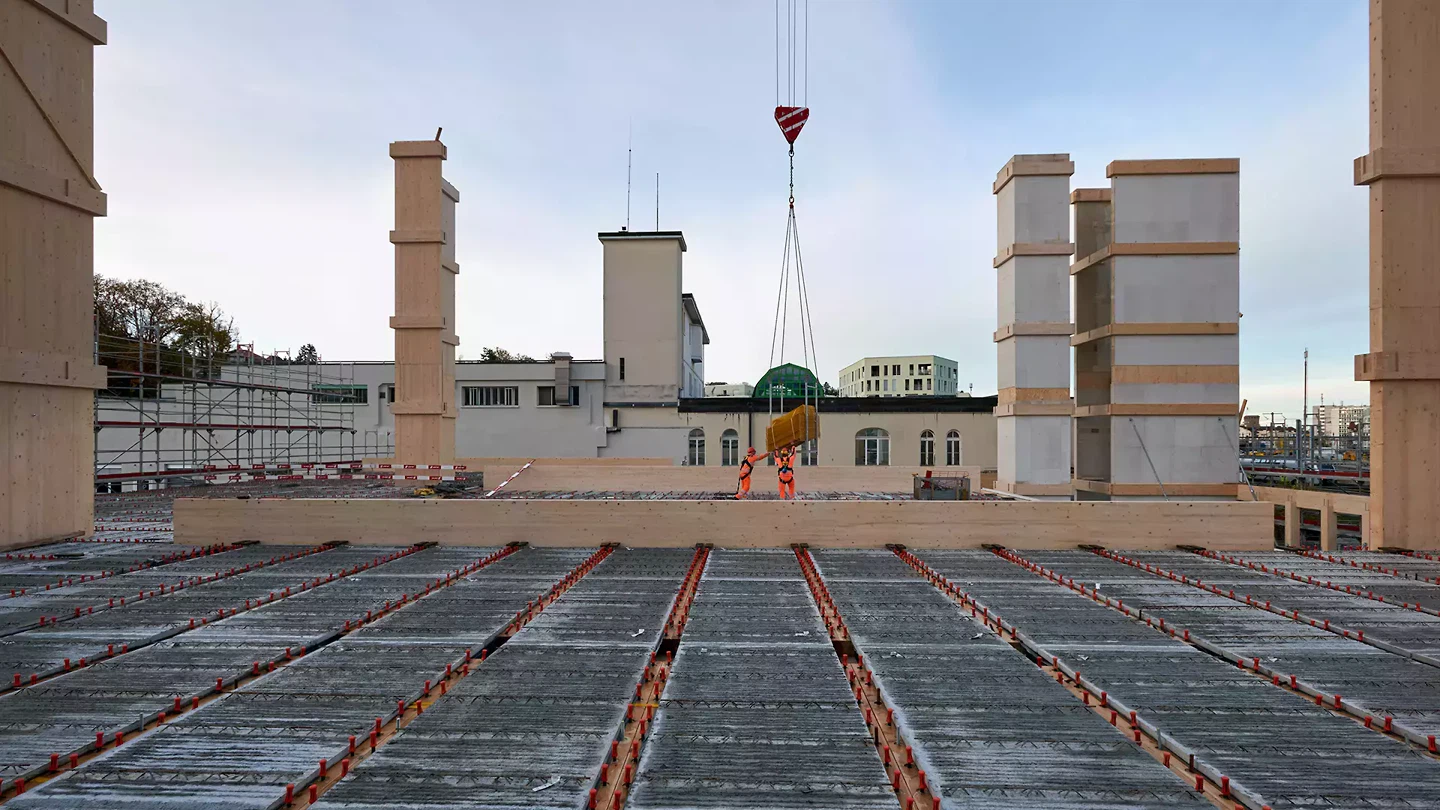 Das tragende Holzbausystem spannt von Fassade zu Fassade und befreit die Mietflächen von tragenden Elementen. In den Obergeschossen rationalisiert ein 165 Zentimeter-Raster die Spannweiten und gewährleistet eine hohe Nutzungs- und Partitionierungsflexibilität. Im Erdgeschoss wird das Raster weiter, um den öffentlichen Bereichen mehr Transparenz zu verleihen. Vier technische Kerne sowie die tragenden Wände der beiden Treppenhäuser übernehmen die Aussteifung; die Rahmen der Aussen- und Innenfassaden (Patios) sind zur Aufnahme der Vertikallasten eingeklemmt. Innere Träger mit einer Holz-Beton-Verbunddecke minimieren die statische Geschosshöhe. Diese Bauweise ermöglicht einen hohen Vorfertigungsgrad und garantiert gleichzeitig grosse räumliche Modularität. Die Besonderheit des Projekts liegt in der Verwendung von Holz für die Treppenhaus- und Liftkernwände sowie für die aussteifenden Wände – Elemente, die üblicherweise in Stahlbeton ausgeführt werden. Für seine ausschliessliche Nutzung von rund 2000 Kubikmetern lokalem Freiburger Holz in Tragwerk und Fassaden wurde das Gebäude mit dem Label Bois Suisse ausgezeichnet.