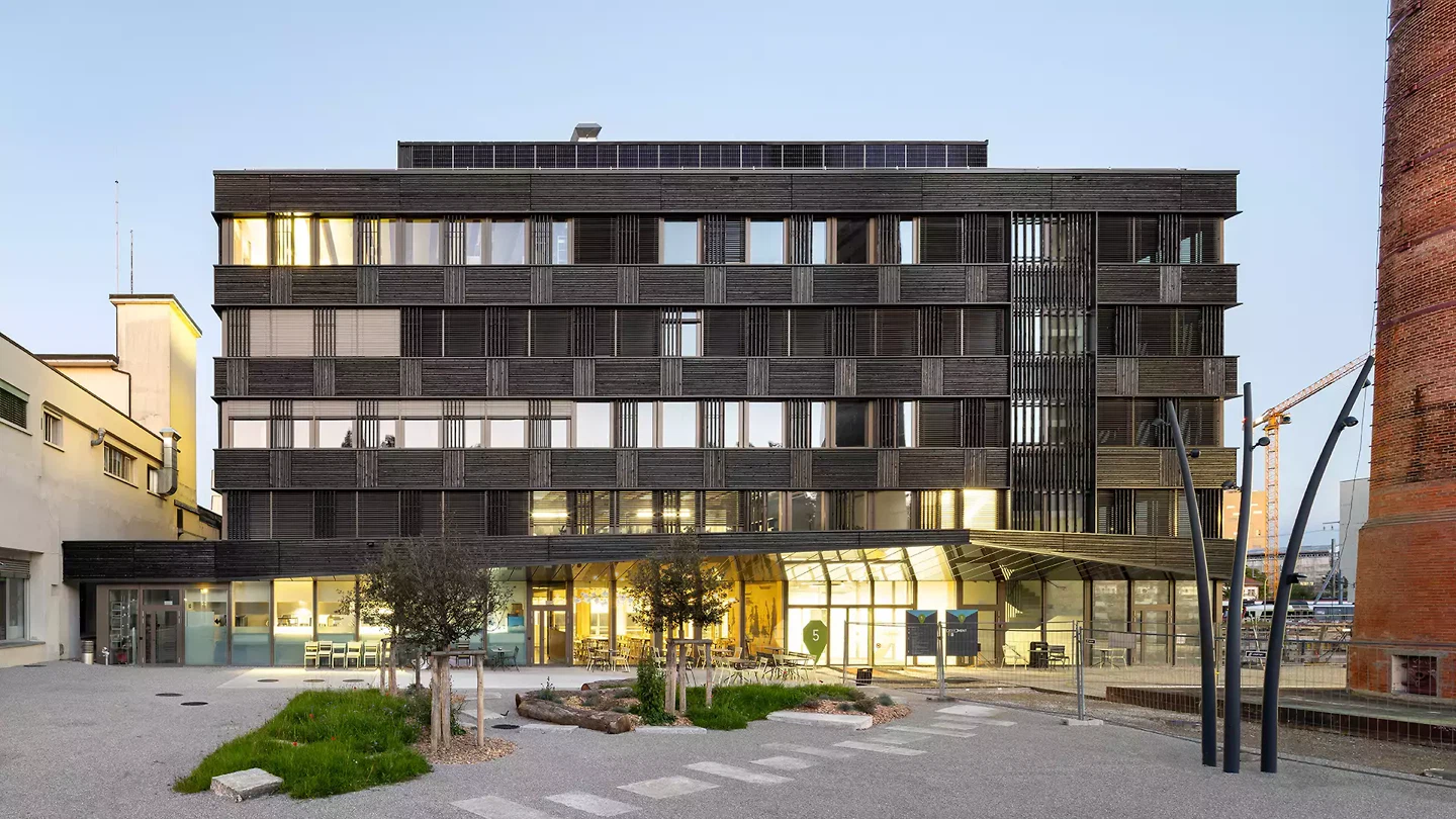 Das verbrannte Holz bildet einen starken Kontrast zur denkmalgeschützten Fassade des Gebäudes A und hebt diese dadurch hervor. Das zeitstabile Material ist vollständig wartungsfrei. Die Erscheinung des verkohlten Holzes betont die kraftvollen Horizontalen der Fassade. Seine Struktur, Verarbeitung und Farbnuancen verleihen der industriell geprägten Fassade eine lebhafte Textur, wodurch das Gebäude weniger massiv wirkt und zugleich haptischer erscheint. Die städtebauliche Integration, die identitäre Vielfalt, die breite Palette an Nutzungen und die Originalität der Infrastrukturen machen bluefactory zu einem lebendigen Innovationsort. Das Quartier beherbergt innovative Unternehmen, akademische Institutionen, Handwerksbetriebe, Restaurants, Gemeinschaftsgärten und kulturelle Akteure – ein vielfältiges und inklusives Gefüge. Als erstes dauerhaftes Gebäude des Areals verkörpert Gebäude B all diese Werte und verankert die bluefactory nachhaltig im Freiburger Stadtbild.