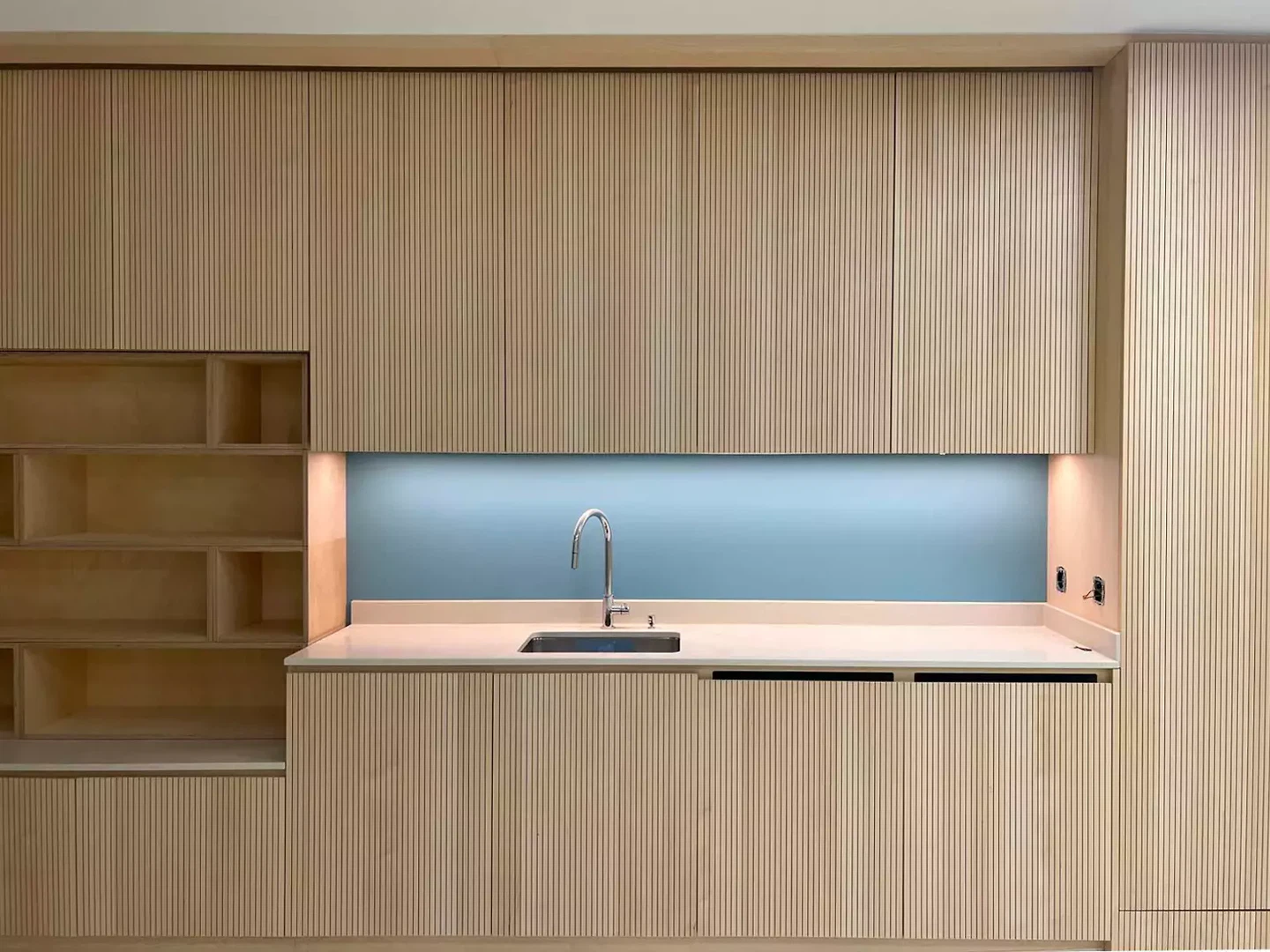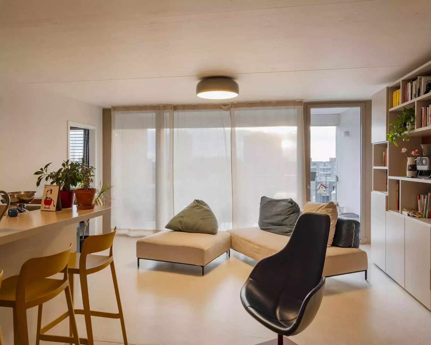 Das Spiel der Loggien, abwechselnd als vollflächige Öffnungen über die gesamte Geschosshöhe oder als eingeschnittene Öffnungen in den Gebäudeecken, strukturiert elegant die Fassaden und betont die ineinandergreifende Volumetrie der beiden Baukörper. Die leichte Abweichung von der Orthogonalität wird bewusst genutzt, um eine subtile Spannung in den Grundrissen zu erzeugen und so die Offenheit und Dynamik der Wohnräume hervorzuheben.