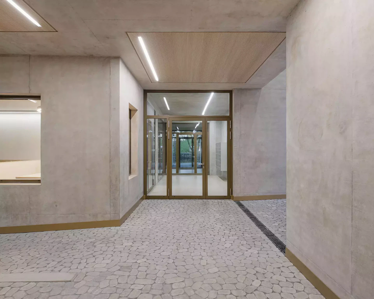 Mit seinem Hof, seinem schwebenden Garten, der Vielfalt an Begegnungsorten, teils beinahe verborgen, und der inhaltlichen Dichte seines Programms ist es gelungen, eine urbane Form zu zähmen, die ursprünglich wenig wohngeeignet war und aus einem komplexen, projektfremden Planungsprozess hervorgegangen ist. Zwei Baukörper grosser Tiefe sind in einem nicht ganz orthogonalen Winkel zueinander angeordnet. Diese vorgegebene Form wurde gezielt modelliert, um eine Vielfalt an räumlichen Situationen zu ermöglichen, von denen das Programm letztlich profitiert. Ein grosszügiger, erhöhter Innenhof bringt Licht in die Tiefe der Wohnungen, schafft einen ruhigen Freiraum für die Waschküche und stellt eine zusätzliche Verbindung zwischen den beiden Treppenhäusern her. Im Erdgeschoss kreuzen sich zwei Achsen: eine offene Passage, die die Strasse mit dem Hof verbindet und zugleich als überdachter Pausenbereich der Schule dient, sowie eine zweite, dazu orthogonale Achse, die in einem Spiel von Transparenz die aufeinanderfolgenden Eingangsbereiche der Schule und der beiden Wohnhaustreppen erschliesst. So erhält die Schule ihre Eigenständigkeit mit direktem Zugang zu den Plaines-du-Loup, bleibt jedoch eng mit den gemeinschaftlichen Aussenräumen verbunden. Der Mehrzweckraum mit seiner Küche, die bepflanzten Flächen im Hof sowie die Passage als überdachter Aussenraum schaffen zahlreiche Synergien zwischen Wohnnutzung und Schule.