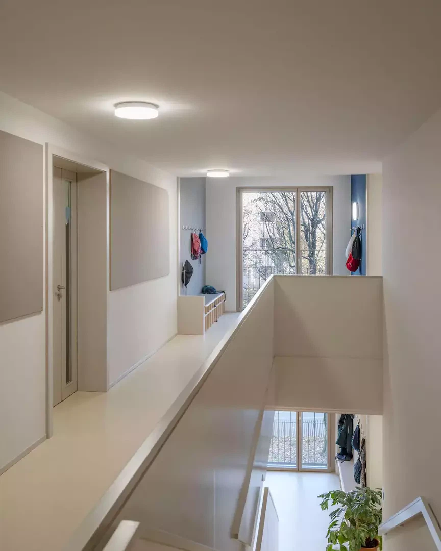 Mit den Labels Minergie-P und Minergie-ECO ausgezeichnet, wurde das achtgeschossige Gebäude (R+8) mit einem Holzkranz um einen Betonkern realisiert. Das Holz bringt seine Wärme in die Wohnbereiche ein, während der Beton seine Ausdruckskraft in den öffentlichen und gemeinschaftlichen Räumen entfaltet. Ein grosser Teil des Betons besteht aus rezyklierten Zuschlägen und wird je nach Situation differenziert eingesetzt: weich und eingefärbt in der Passage im Erdgeschoss, sandgestrahlt und eingefärbt im Sockelbereich sowie mit den Abdrücken der OSB-Schalungen in den Treppenhäusern.